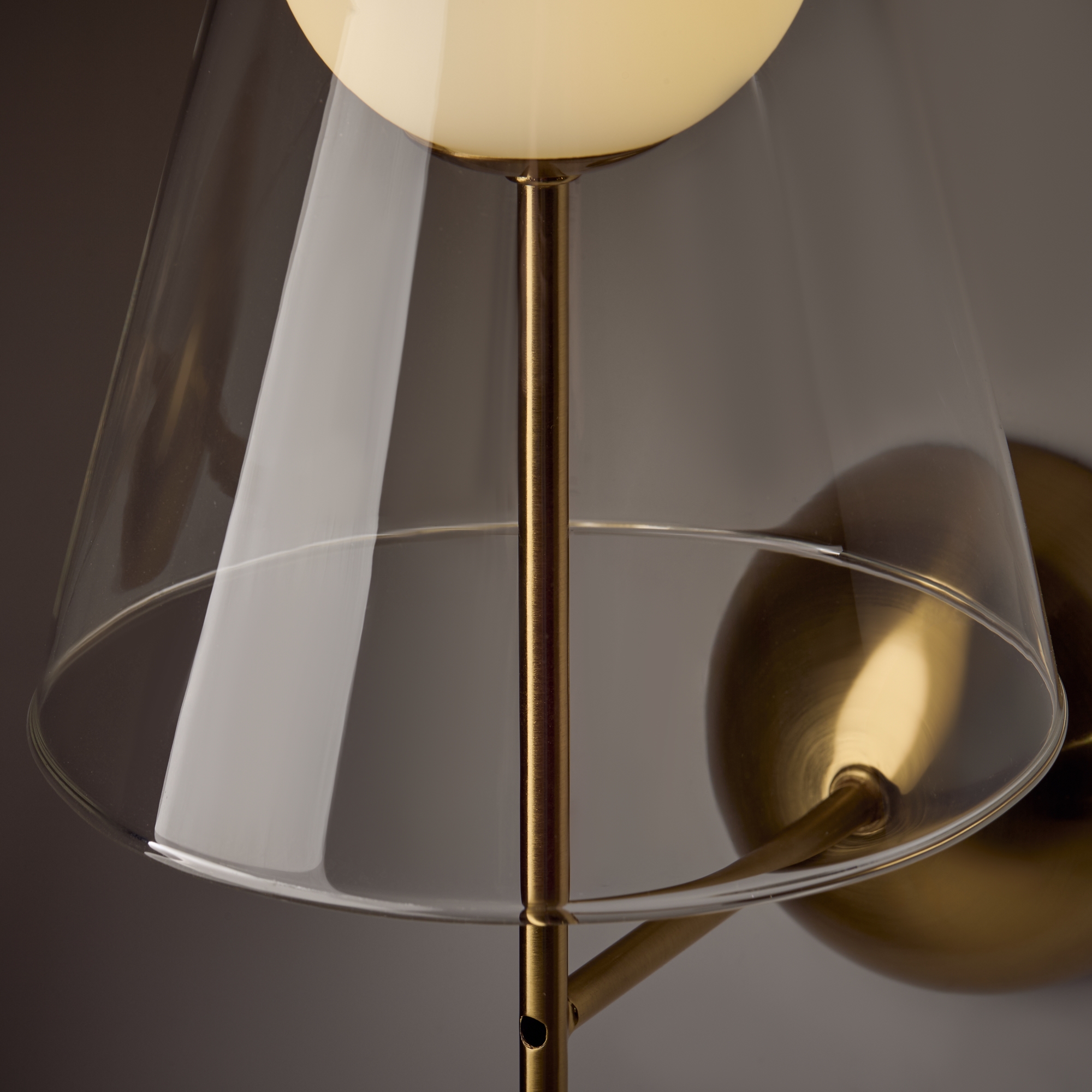 Арматура — металл, цвет — латунь. Двойные плафоны из стекла. Внешний — прозрачный в форме конуса плавно обрамляет контуры внутреннего матового сферического плафона. Свежий взгляд в дизайне на комбинацию форм и фактур. Источником света служит лампа с цоколем G9.