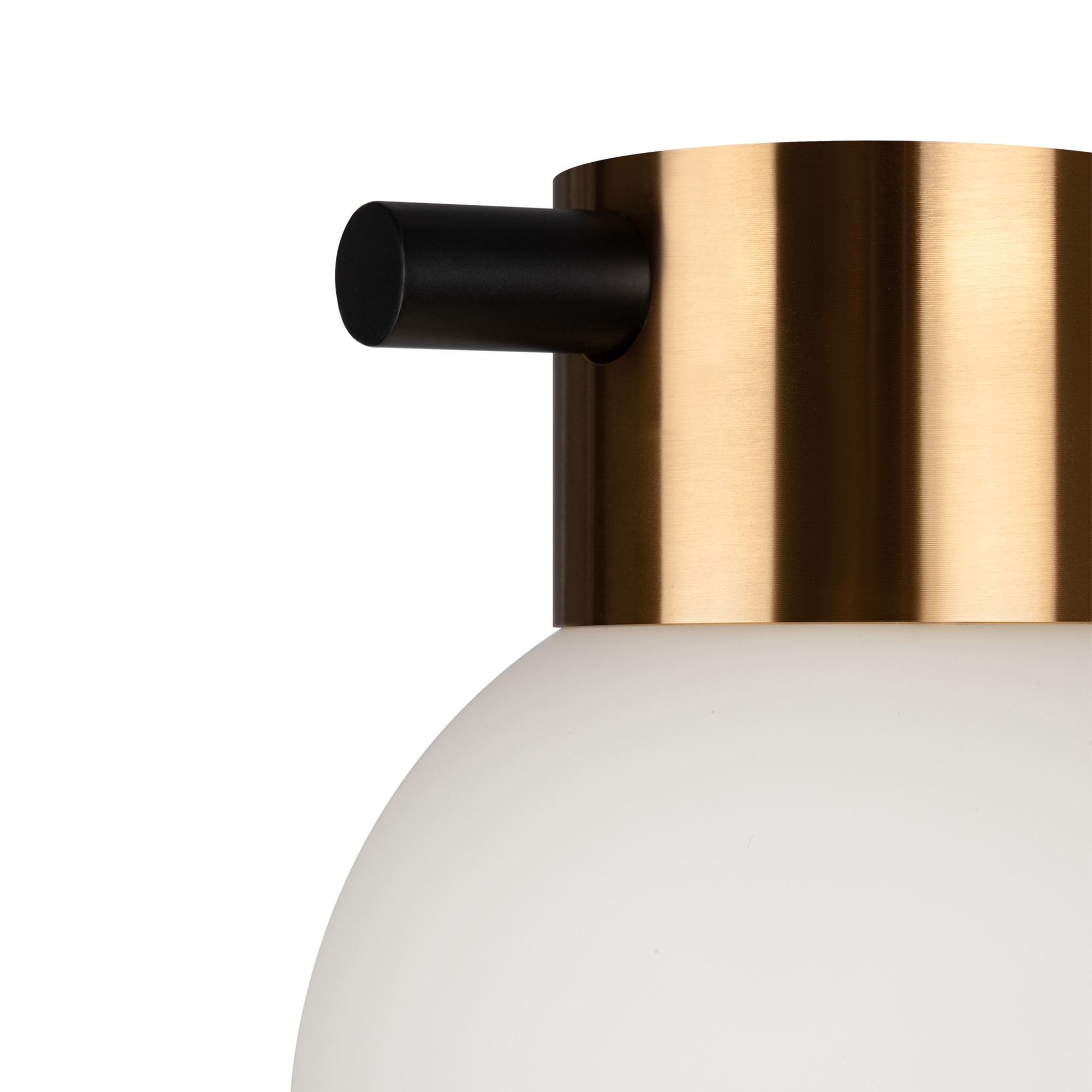 Металлическая арматура, цвет — черный + латунь. Стеклянные плафоны в двух оттенках — матовый белый или дымчатый. Направление плафонов в разные стороны позволяет распределить свет максимально равномерно. Источник светал — лампы с цоколем G9.