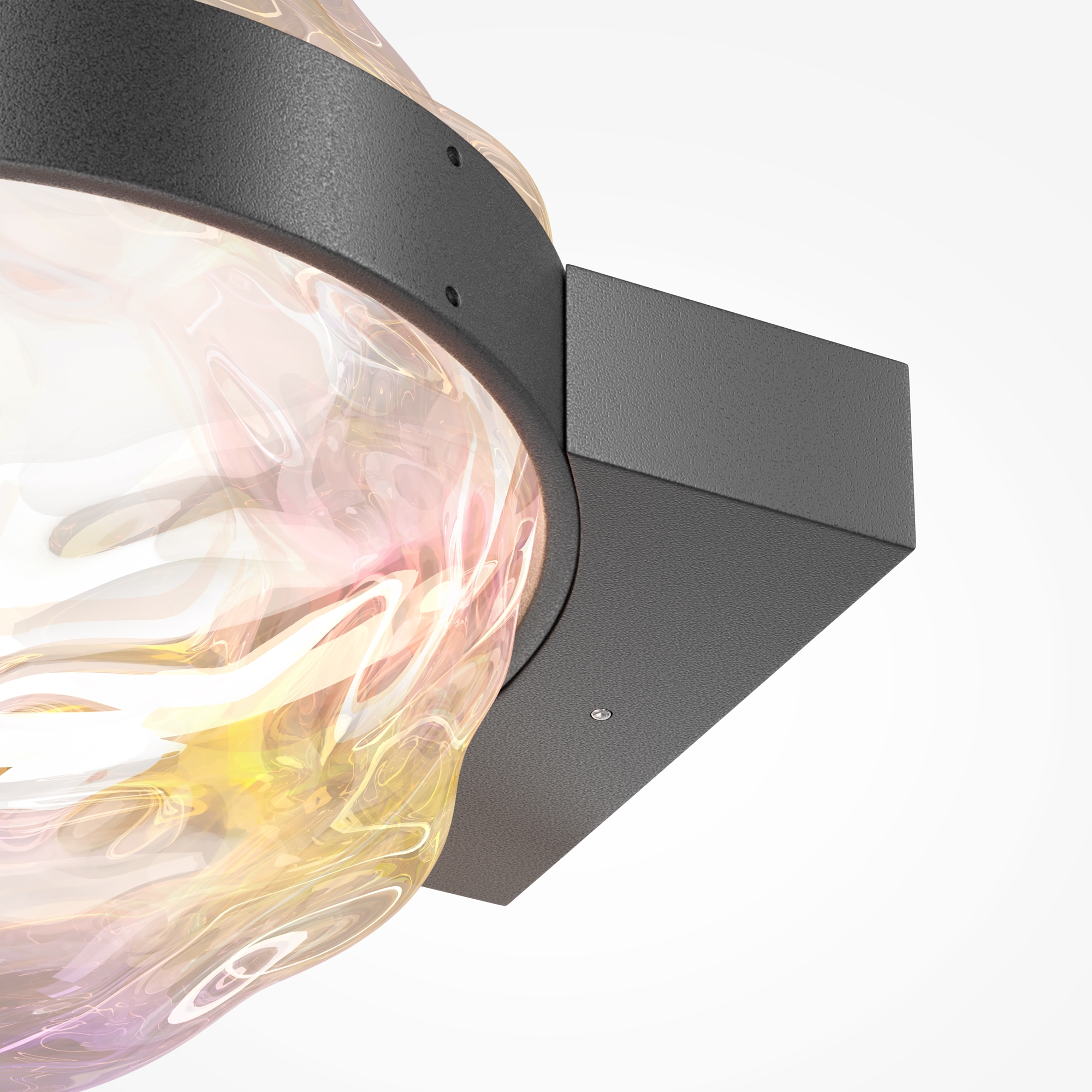 Цвет арматуры — черный. Материал плафона — литое стекло с эффектом «multicolor». Оригинальный волнообразный дизайн плафона. LED-источник света (3000К) в форме кольца вокруг плафона создаёт яркие плавные световые орнаменты на окружающих поверхностях. Подвесные модели (одиночные и композиция из трёх), настольный светильник и бра. Равномерный и комфортный световой поток благодаря матовому рассеивателю. Сенсорный включатель у настольной лампы с функцией диммирования.