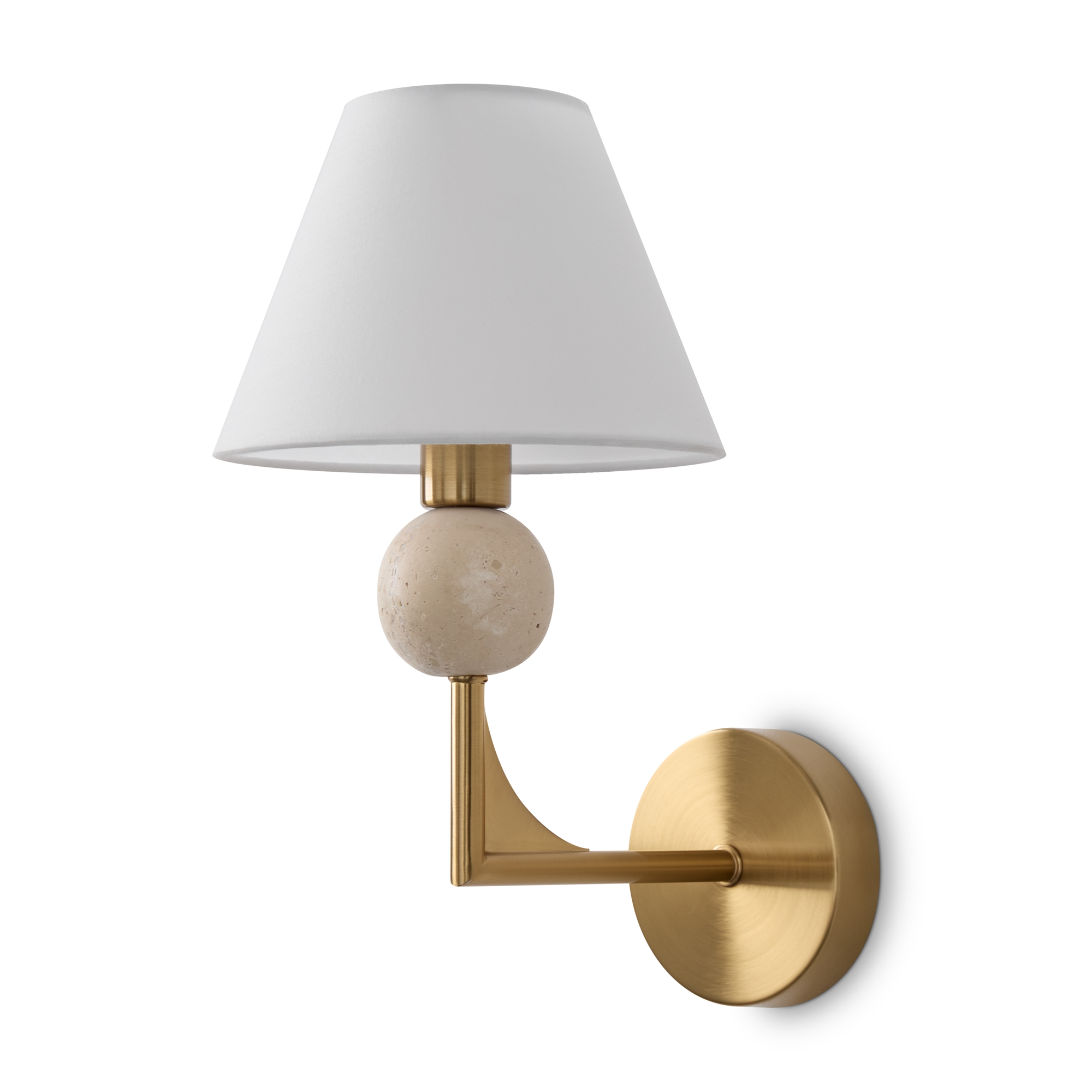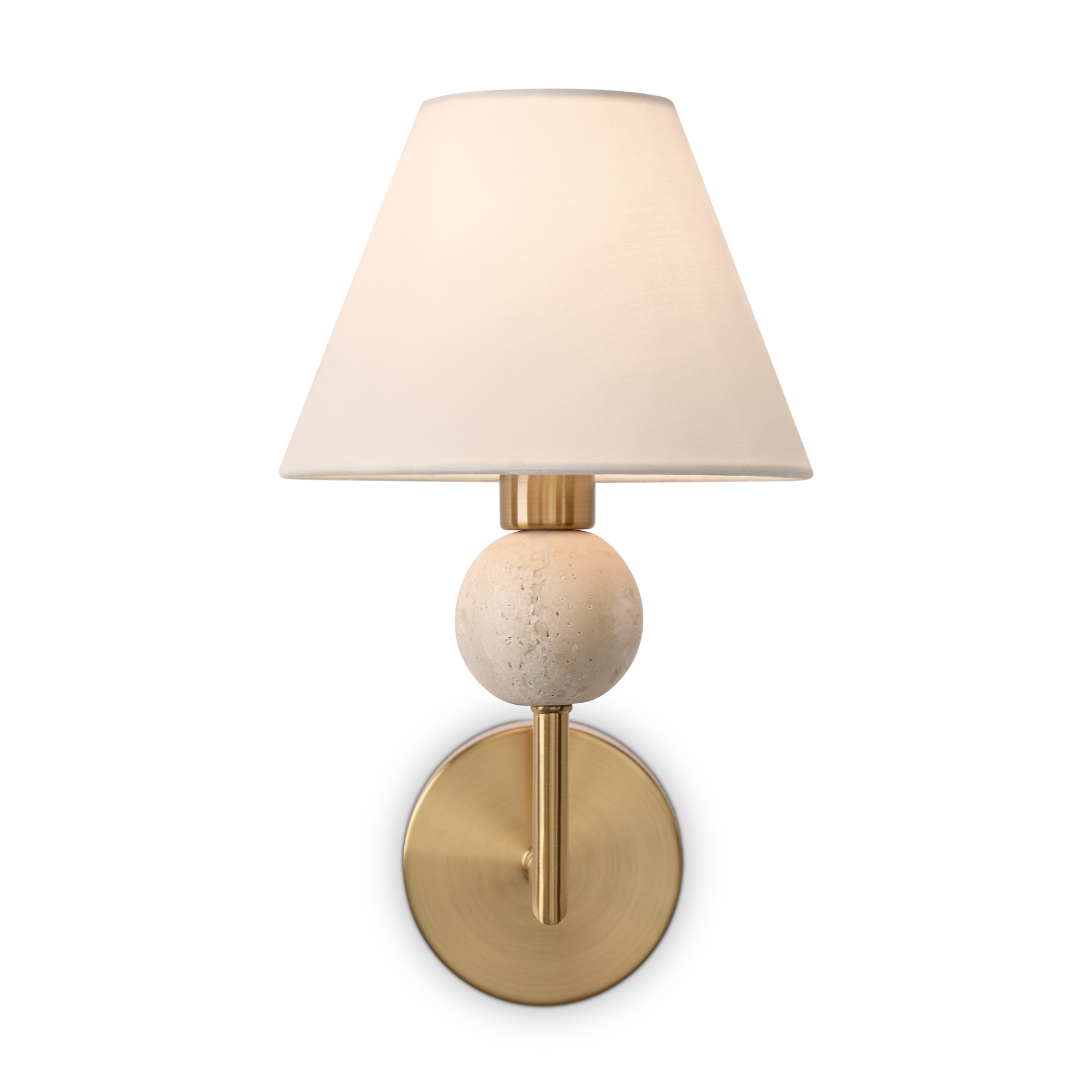 Материал арматуры — металл. Цвет металла — латунь. Абажуры выполнены из белой ткани, которые мягко рассеивают свет. Потолочные и настенные светильники с цоколем E14. Декоративные элементы в форме шара на плафоне выполнены из травертина. Металлическая форма арматуры строгой геометрической формы с пластинами из латуни. Подходит для оформления элегантных классических пространств.
