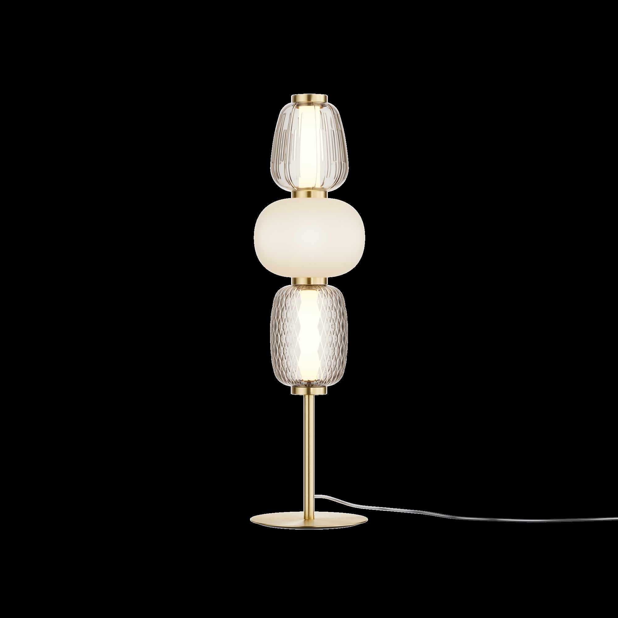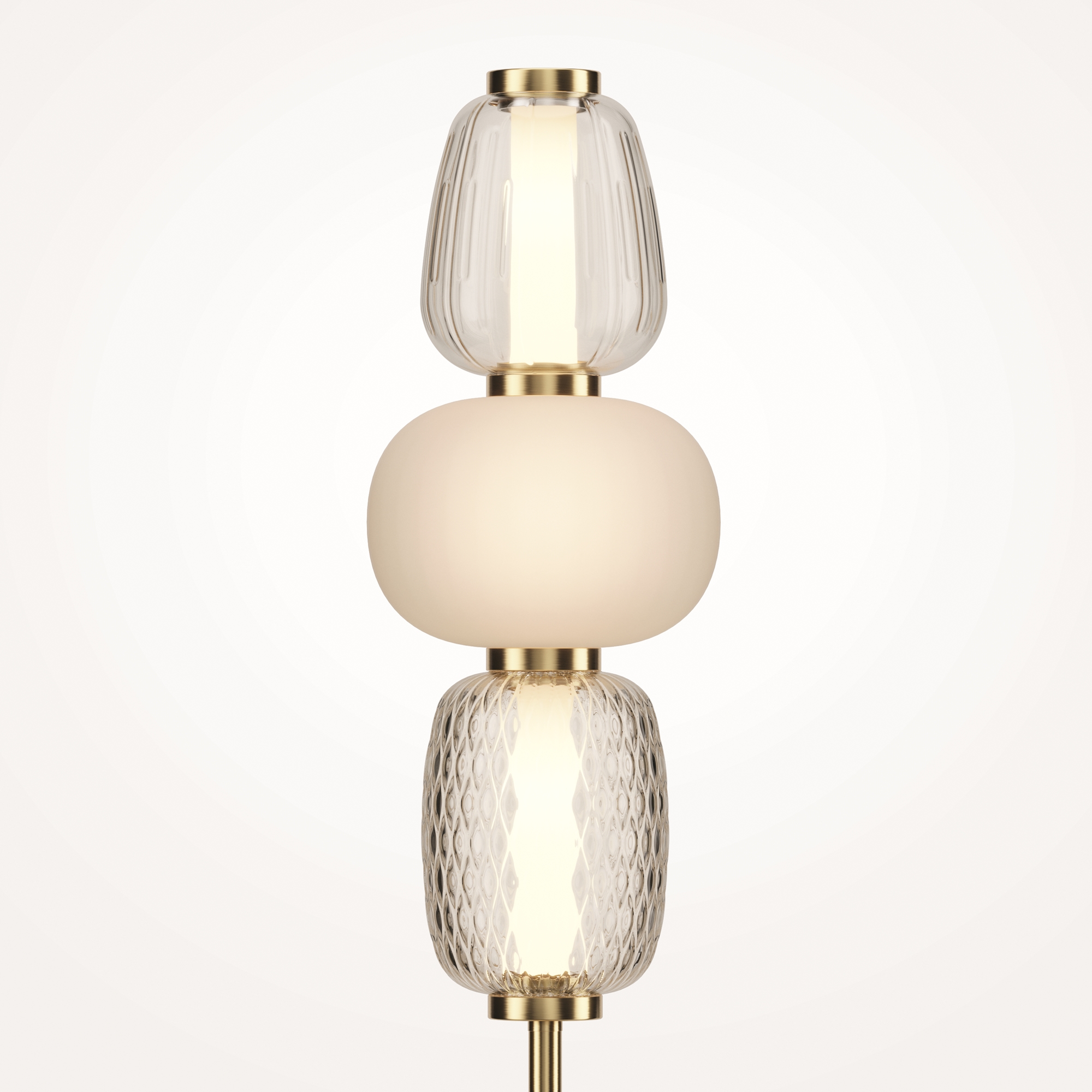 Металлическая арматура, цвет — золото, хром. Микс плафонов округлых и вытянутых форм из белого матового и прозрачного стекла с сетчатым и с линейным повторяющимся рельефным рисунком. Регулируемая высота подвесных моделей, провод — 3 метра. LED-источник света, цветовая температура 3000К.
