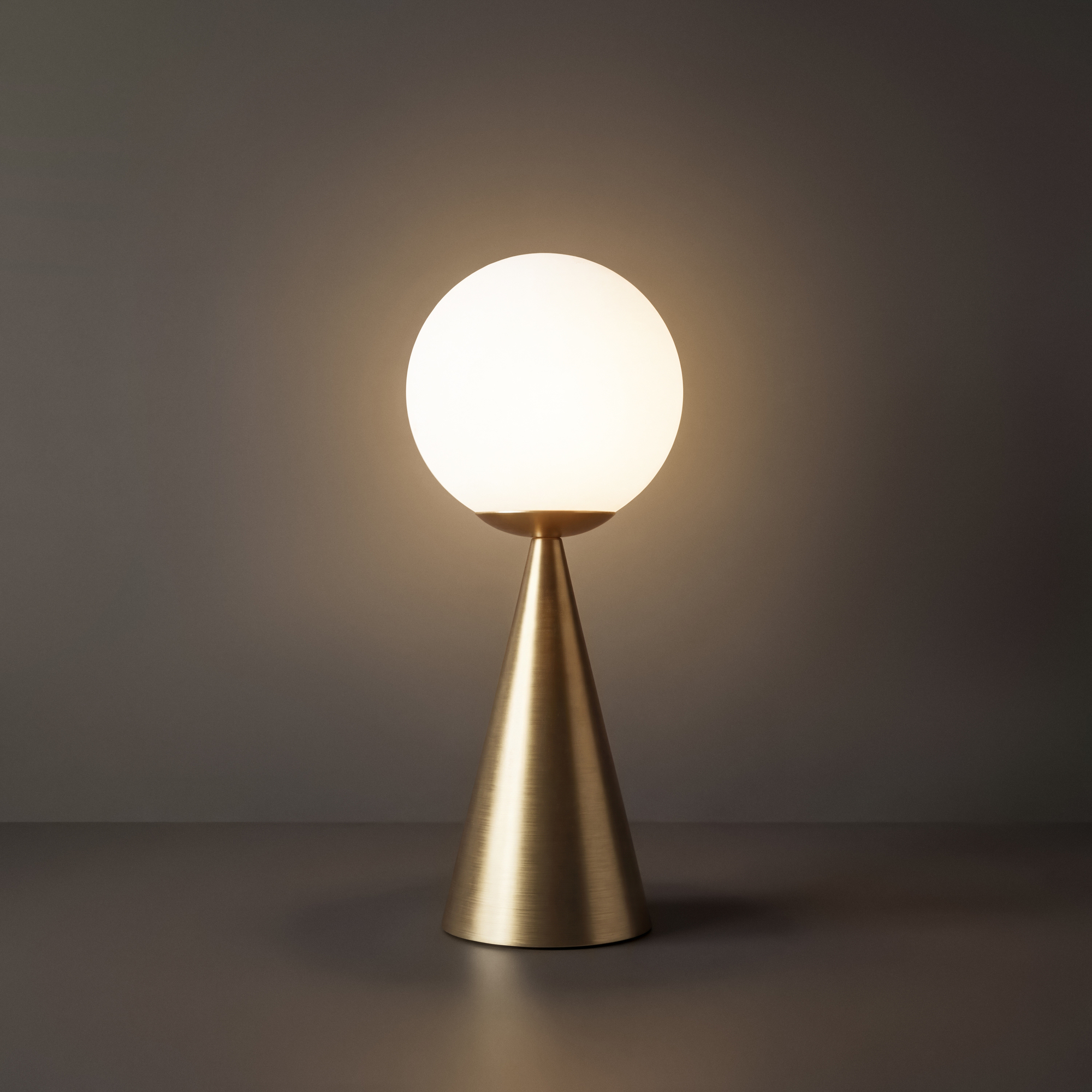 Материал арматуры — металл, цвета — латунь, черный. Плафон-сфера из белого матового цвета. Функция Touch позволяет включать и выключать свет. Источник света — лампа с цоколем Е14.