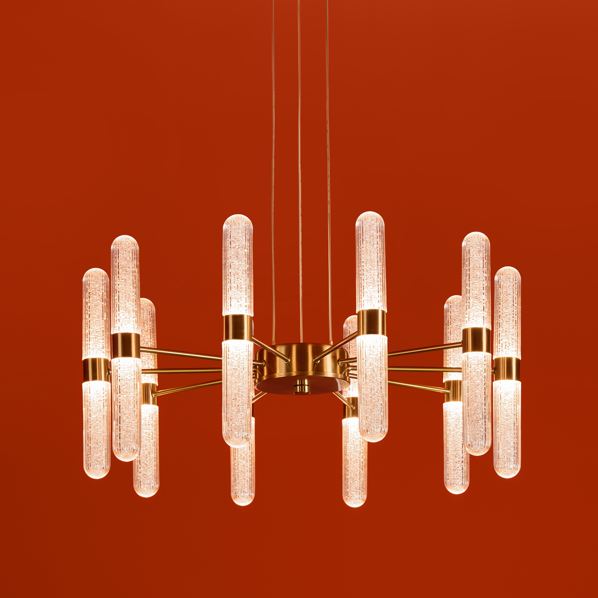 Арматура — металл в цвете латунь и никель. Основной акцент в дизайне люстр Alias сделан на акриловые плафоны, эффект пузырьков. Встроенный LED модуль 2700K. 2 дизайна подвесных светильников.