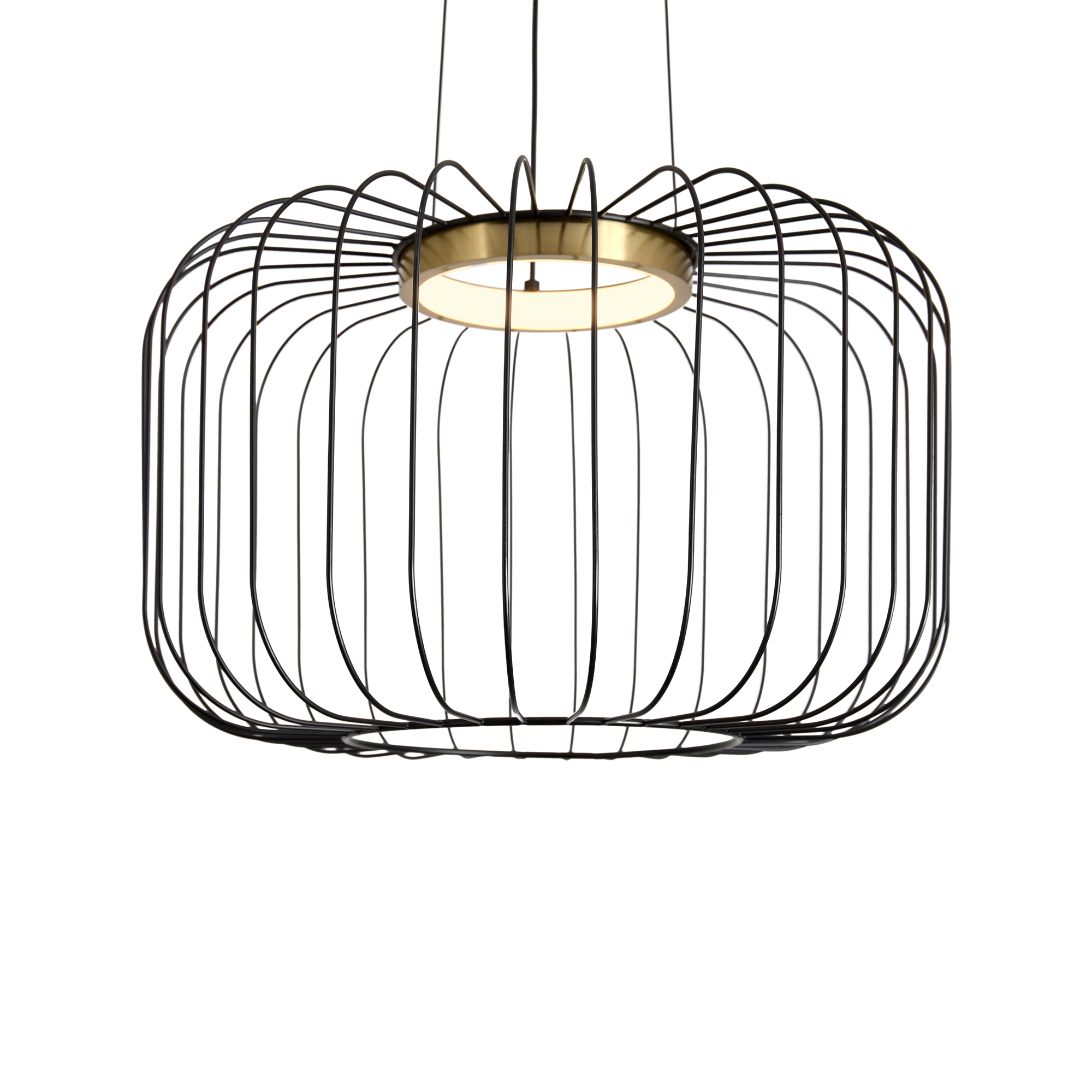 Металлическая арматура чёрного цвета. LED-источник света обрамлен декоративным металлическим кольцом цвета латунь. Минималистичный дизайн — хорошо сочетается с другими осветительными приборами. Высота подвеса регулируется. Цветовая температура — 3000К.