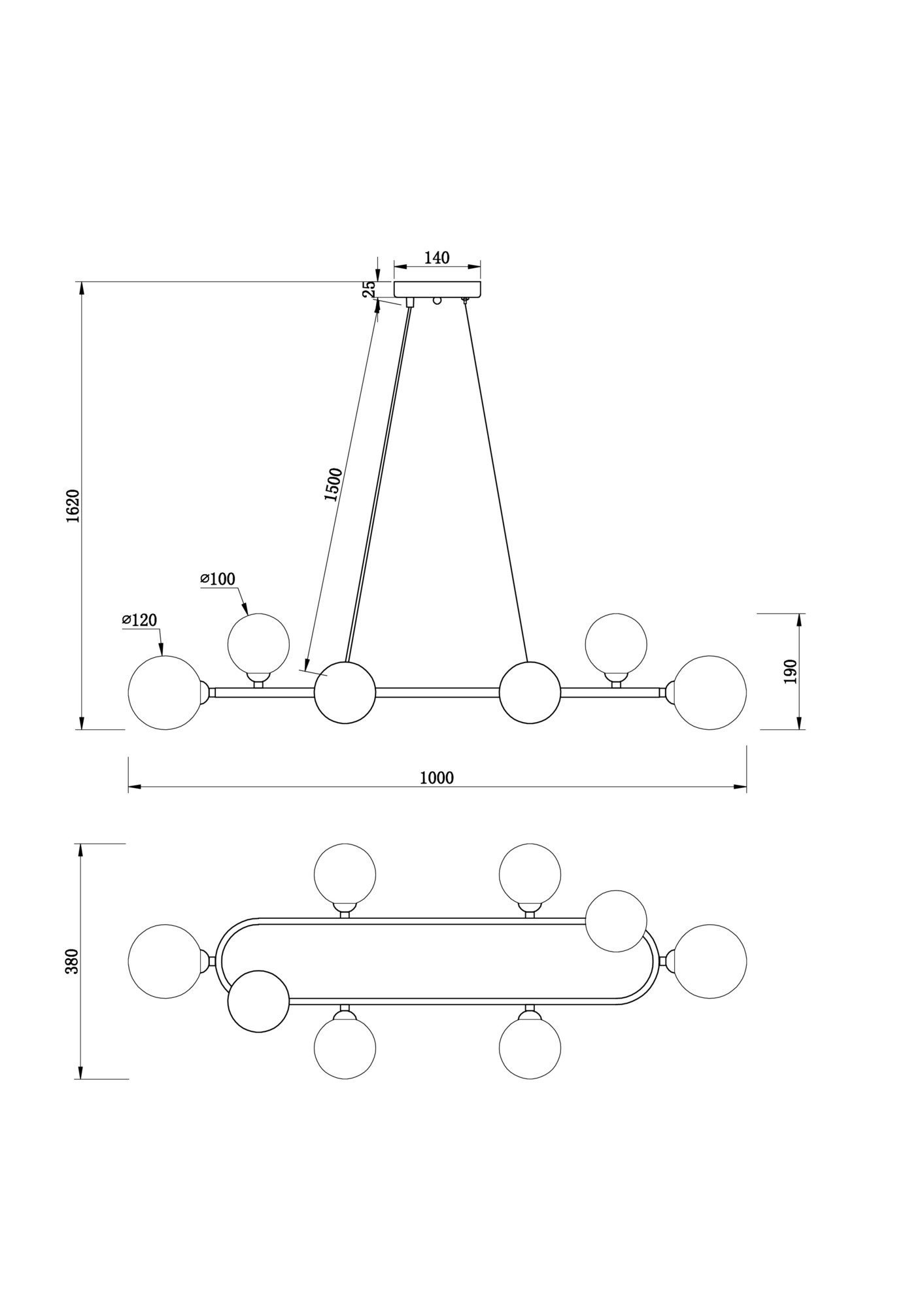 Металлическая арматура, цвета — черный и золотой. Плафоны-сферы из стекла 2х оттенков — матовый белый, полупрозрачный дымчатый — расположены на вытянутом металлическом каркасе, обеспечивая равномерный свет. Тонкие тросы придают светильнику эффект парения. Источник света — лампа с цоколем G9.