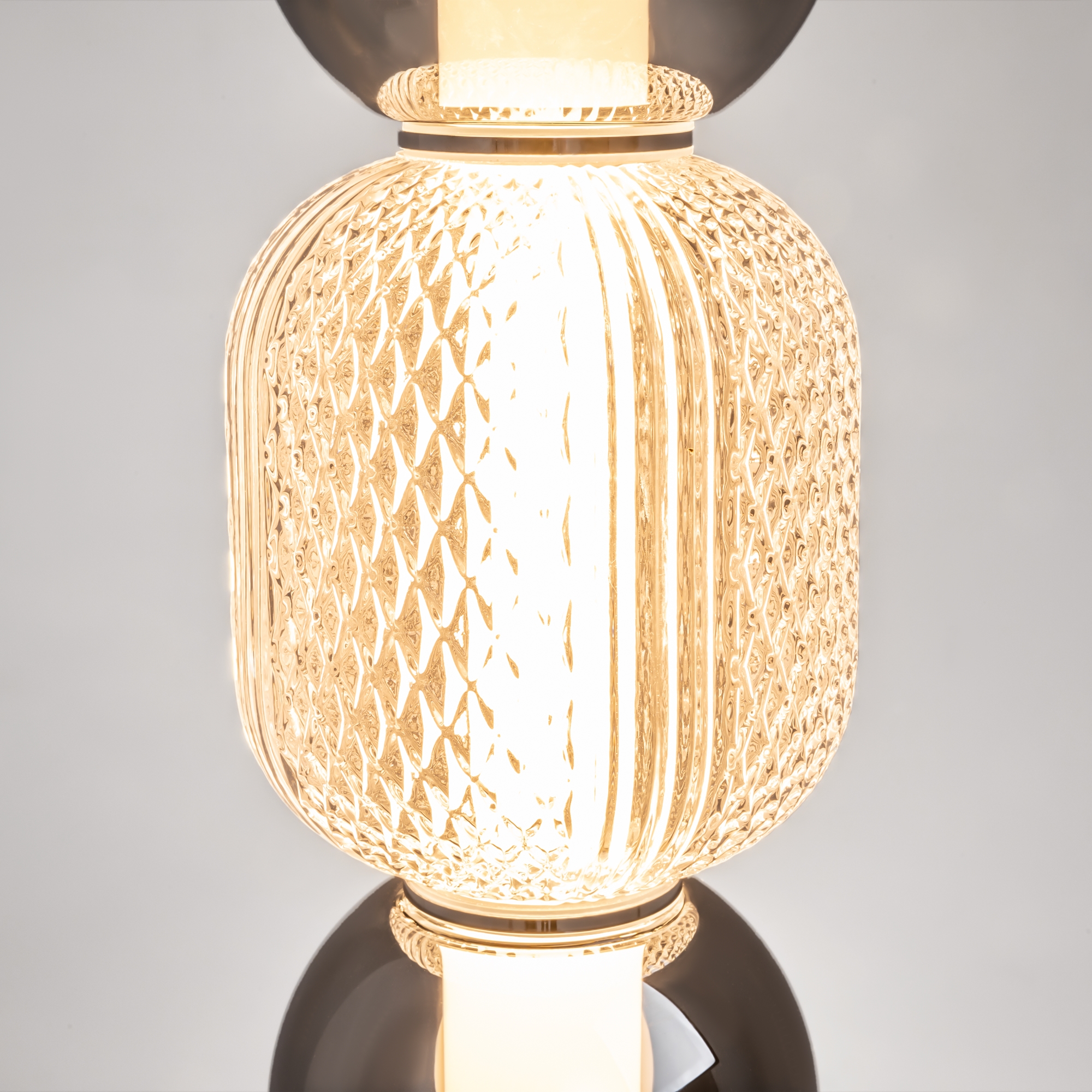Материал арматуры — металл, цвета — золото, хром. Микс плафонов: гладкие cферы коньячного или дымчатого оттенка + округлые рельефные с ромбовидным узором из прозрачного стекла. Регулируемая высота подвесных моделей — максимальная длина провода 3 метра. LED-источник света, цветовая температура 3000К