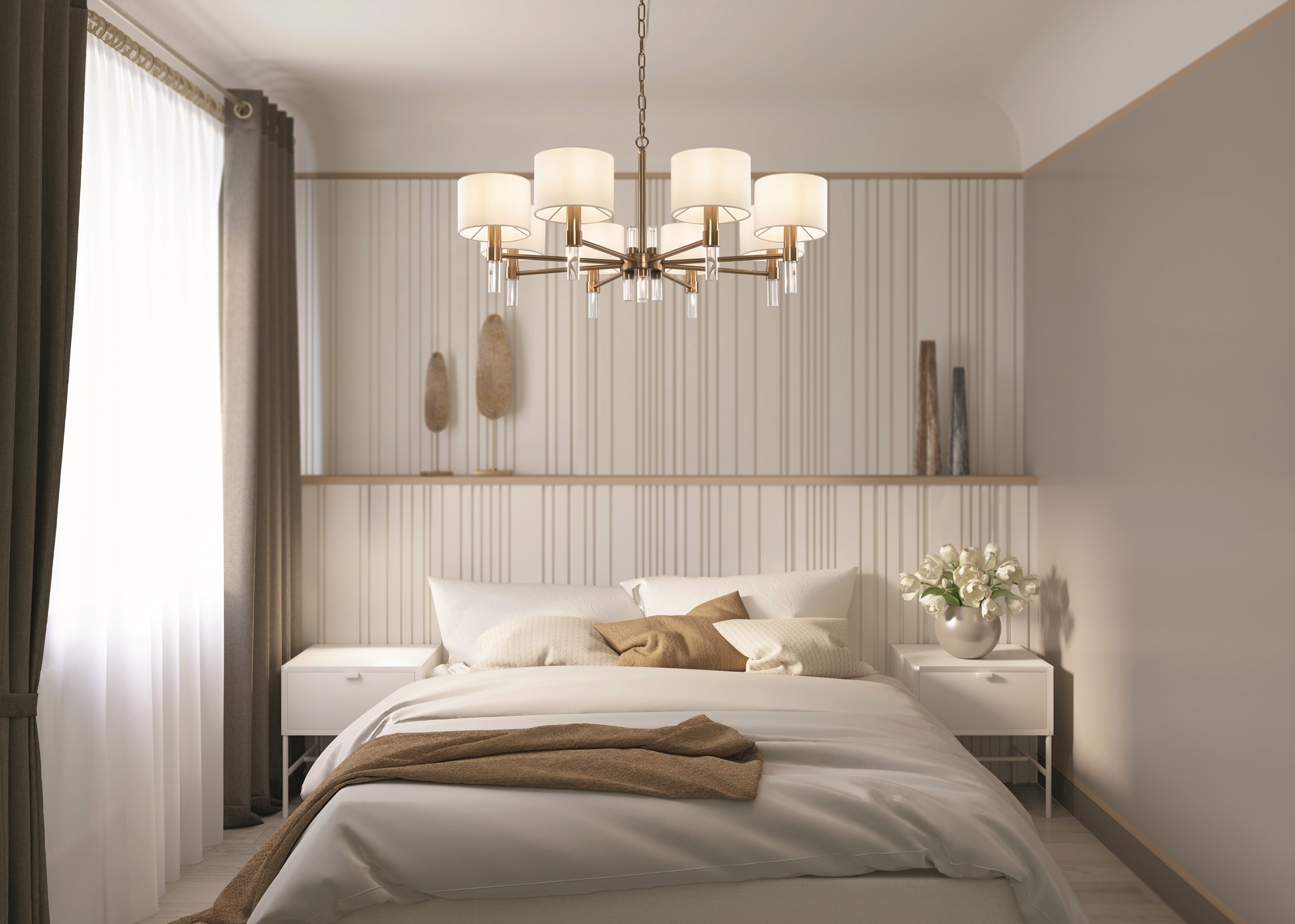 Металлическая арматура. Цвет – латунь. Тканевые абажуры белого оттенка. Декор – прозрачные акриловые трубки. Трендовая комбинация фактур и материалов. Широкий ассортимент. Торшер и подвес с цоколем Е27, лампа, бра и люстры – Е14.