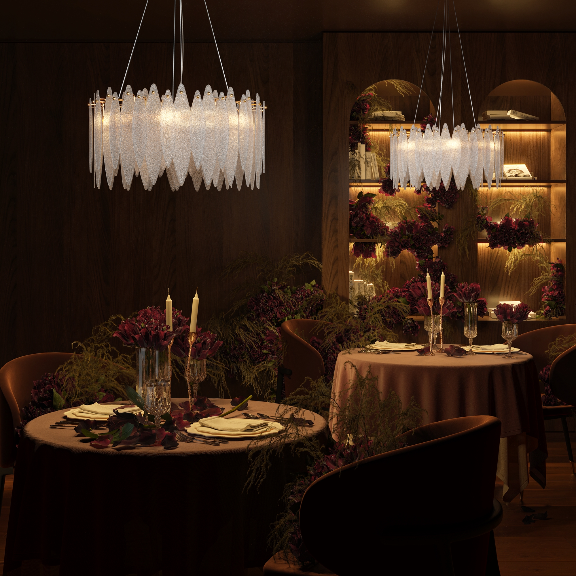 Металлическая арматура, цвет – французское золото. Декоративные элементы выполнены из прозрачного стекла в форме пестрых лепестков ледяной фактуры. Источник света – лампы с цоколем Е14, которые скрыты за декоративными подвесками, размещенными на металлической окружности. Высота подвесов регулируется.