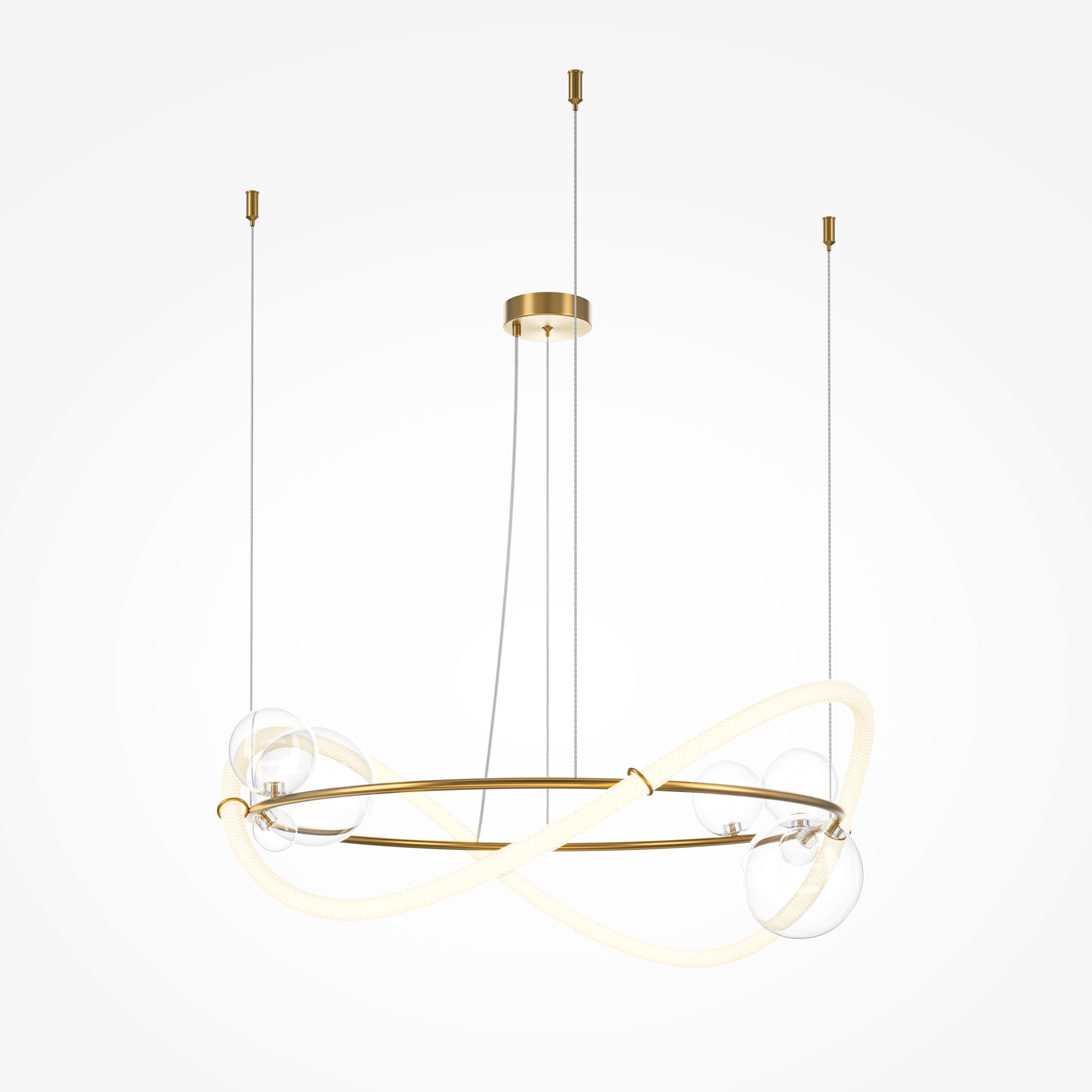 Арматура из металла цвета латуни, материал рассеивателя – текстильный жгут, декоративные элементы выполнены из прозрачного выдувного стекла. LED-источник света. Цветовая температура 3000К, угол рассеивания света 360°. Вертикальное настенное бра включается touch-сенсором. Тканевый шнур. Высота подвесных светильников регулируется.