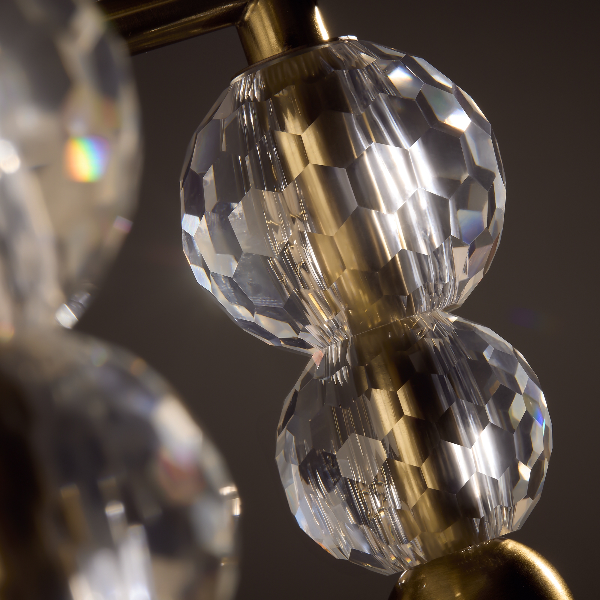 Материал абажура — ткань, цвет — белый. Металлическая арматура в цвете латунь обрамлена хрустальными бусинами. Источник света — лампы с цоколем Е14. Степень защиты — IP20.