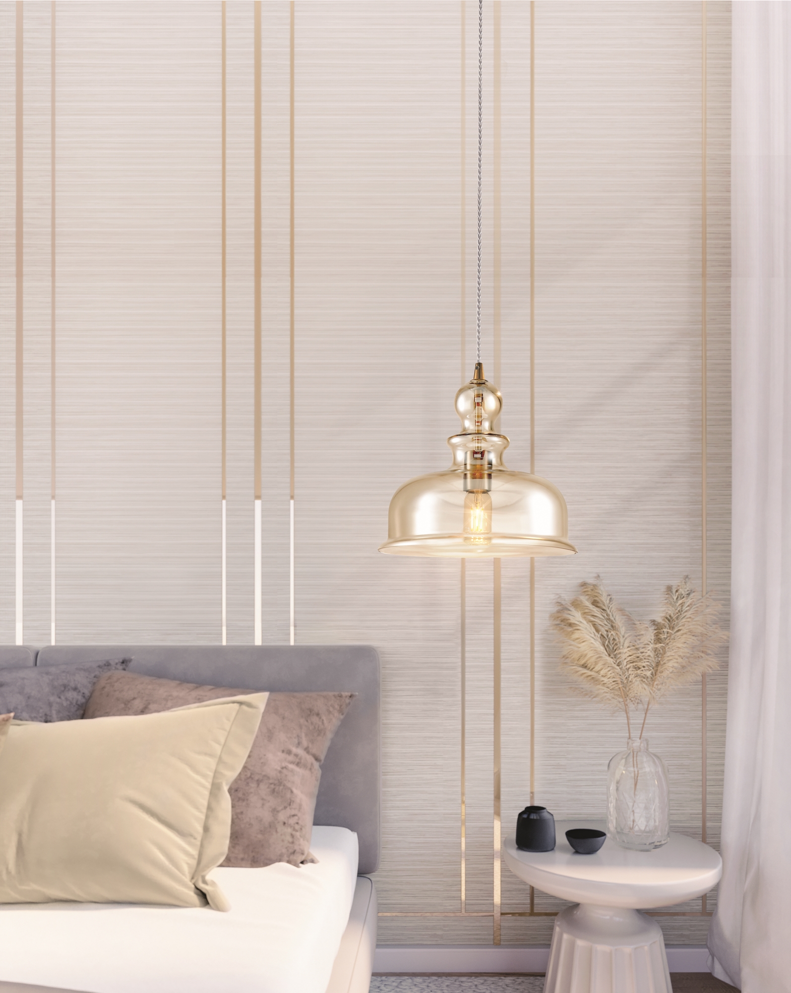 Арматура из металла, оттенок – бронза. Плафон из выдувного стекла в янтарном цвете. Витой провод в текстильной оплетке. Винтажная форма