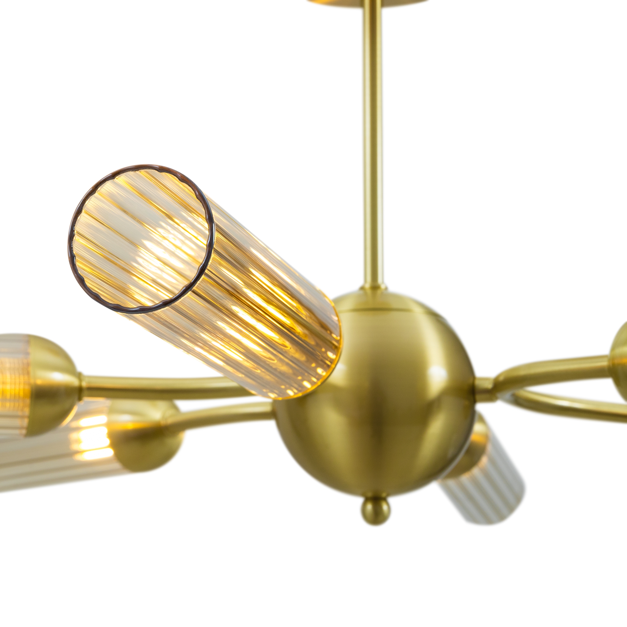 Арматура из металла, цвет — золото. Рельефные плафоны в тренде ZIGZAG. Материал — стекло, цвет — янтарный. Высота подвесных светильников регулируется. Плафоны закреплены на металлическую сферу. Источник света — лампа с цоколем G9.