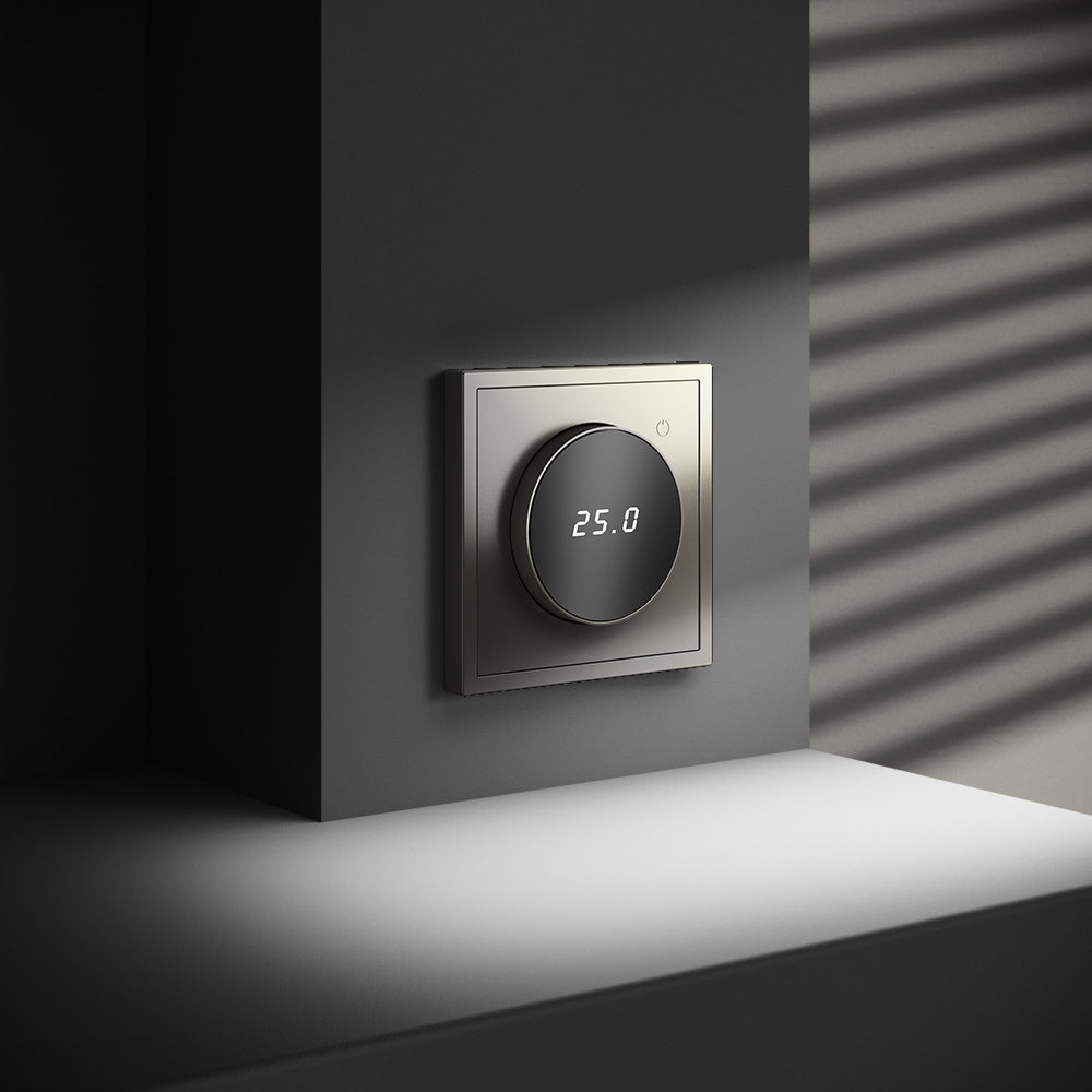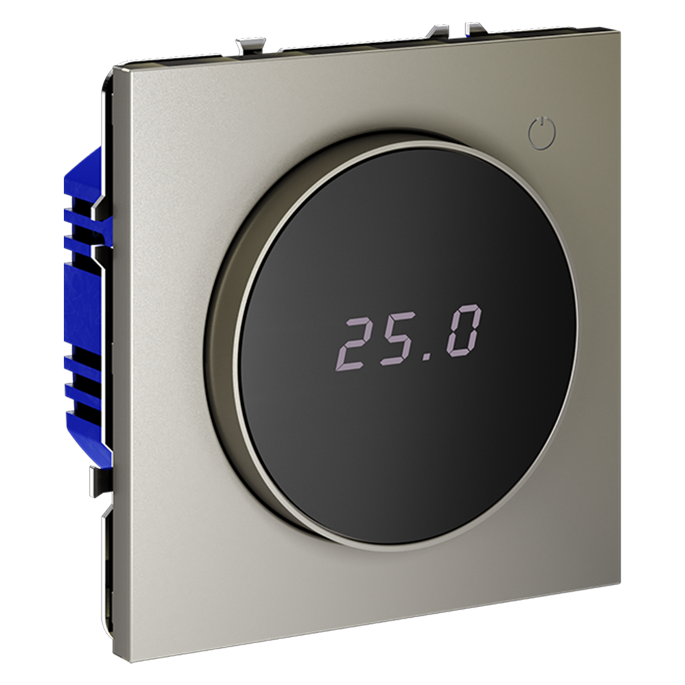 Место установки. Терморегуляторы Voltum предназначены для регулирования температуры электрического теплого пола. Актуальны как в городских квартирах, так и в загородных дачных домах без центрального отопления. Корпус. Дизайн терморегуляторов Voltum сочетается со стилем остальных электрических устройств компании. Они совместимы со всеми рамками S70. Материал внешних декоративных элементов — поликарбонат. Конструктивные особенности. Терморегулятор предназначен для работы с электрическими тёплыми полами различных типов и рассчитан на нагрузку до 3500 Вт. Устройство оснащено дисплеем, на котором отображается температура поверхности пола, обеспечивая удобный контроль системы обогрева. Устройства оснащены светодиодной индикацией режима и дисплеем, на котором отображается температура поверхности пола. Красный индикатор — «подача питания на нагревательный кабель (идет процесс нагрева)», отсутствие индикации — «заданная температура достигнута». В течение 15 минут после нагрева терморегулятор переходит в интеллектуальный «спящий режим», уменьшая яркость подсветки цифр и сокращая энергопотребление. Регулировка осуществляется вращением панели управления. Терморегулятор поставляется в комплекте с механизмом из пластиковой накладки и датчиком температуры.