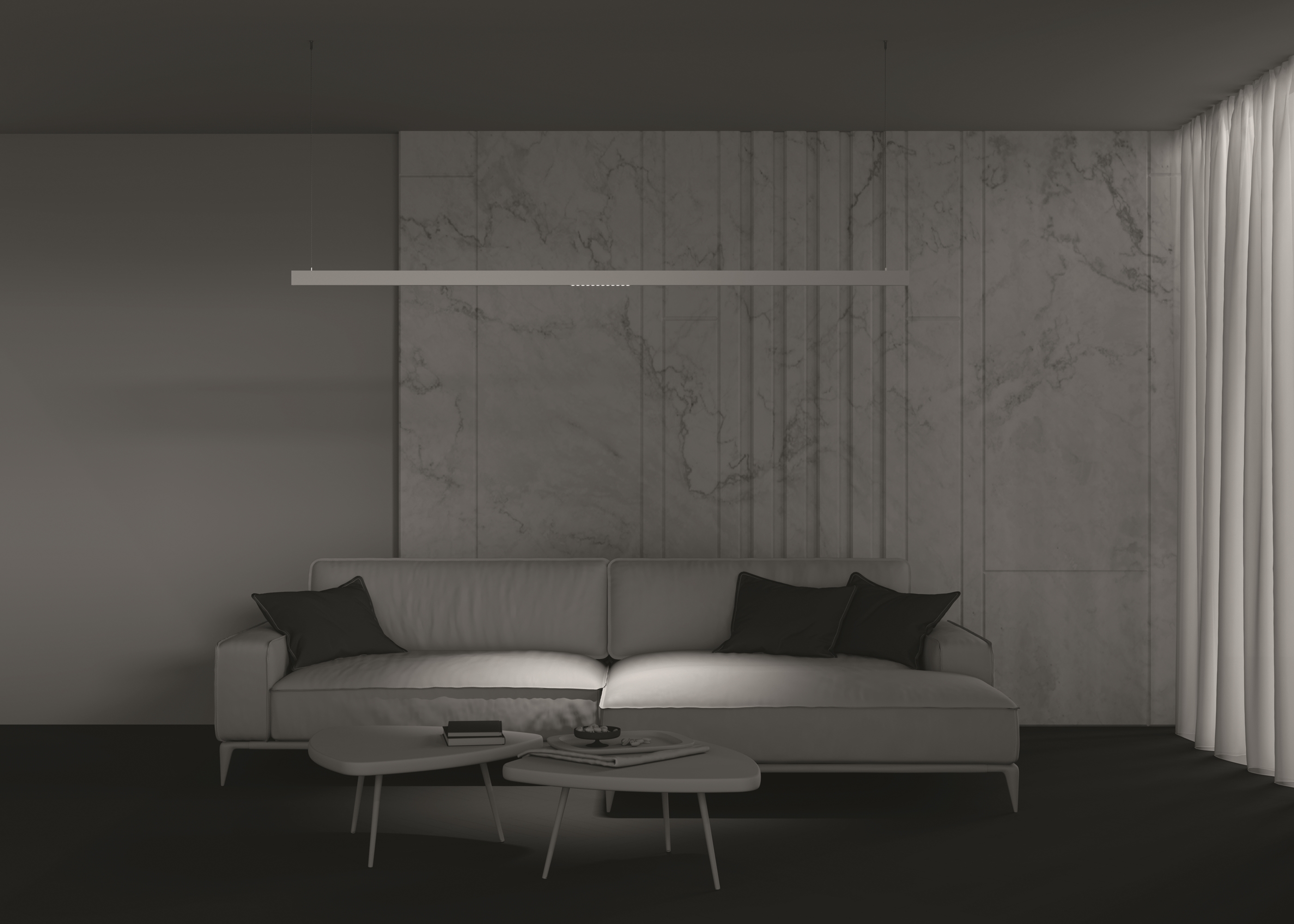 Алюминиевый корпус в черном и белом цветах. Три размера – три варианта мощности. LED-источник света. Скрытый источник света — уникальный оптический эффект «света из ниоткуда. Угол рассеивания — 36°. Цветовая температура 3000К и 4000К, а также умные модели с регулируемым диапазоном от 3000К до 6000К и диммированием по протоколу Bluetooth Mesh. Это позволяет управлять группой или отдельным светильником: вкл/выкл, диммировать, изменять цветовую температуру. Также доступно беспроводное управление светом со смартфона, пульта, с помощью голосовых помощников.