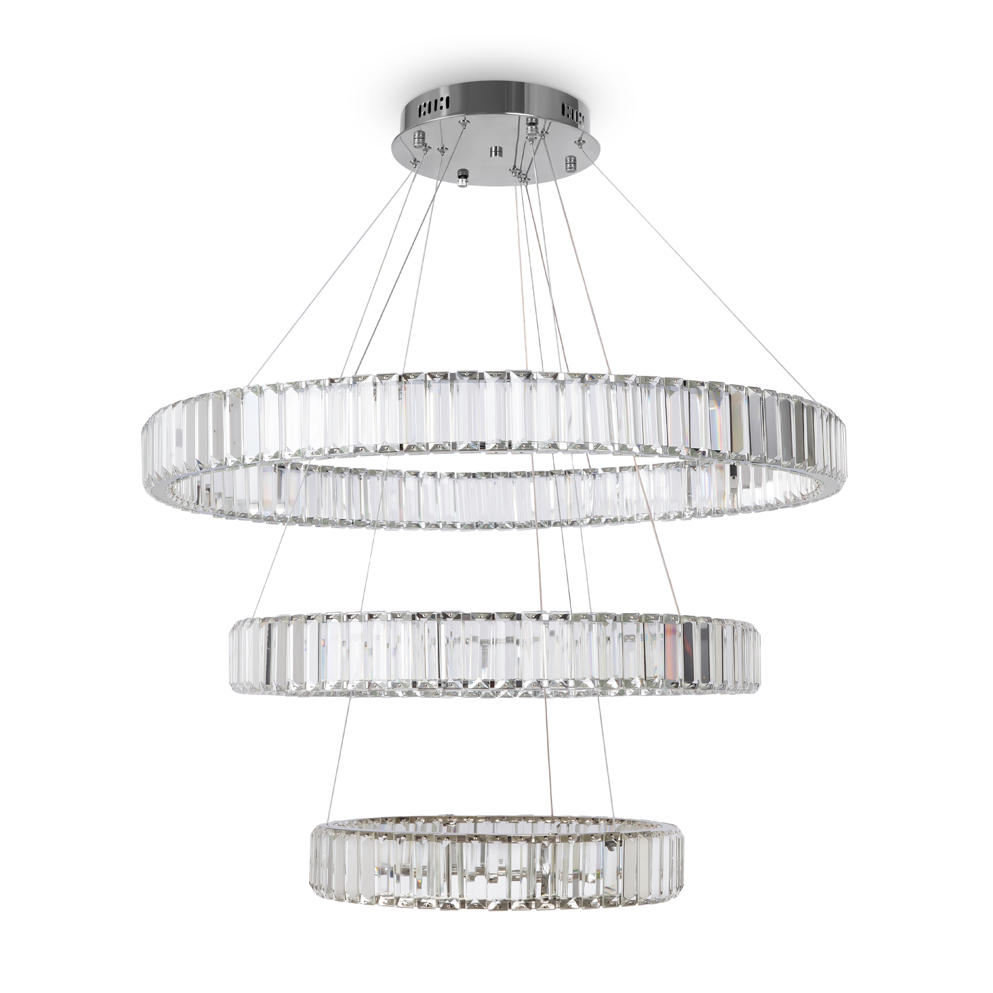 Металлическая арматура в цвете латунь и хром. Хрустальные декоративные кольца с геометричными гранями. LED-источник света. Регулировка цветовой температуры (3000-4000-5000K) и яркости 4G-dimming при помощи пульта (в комплекте).