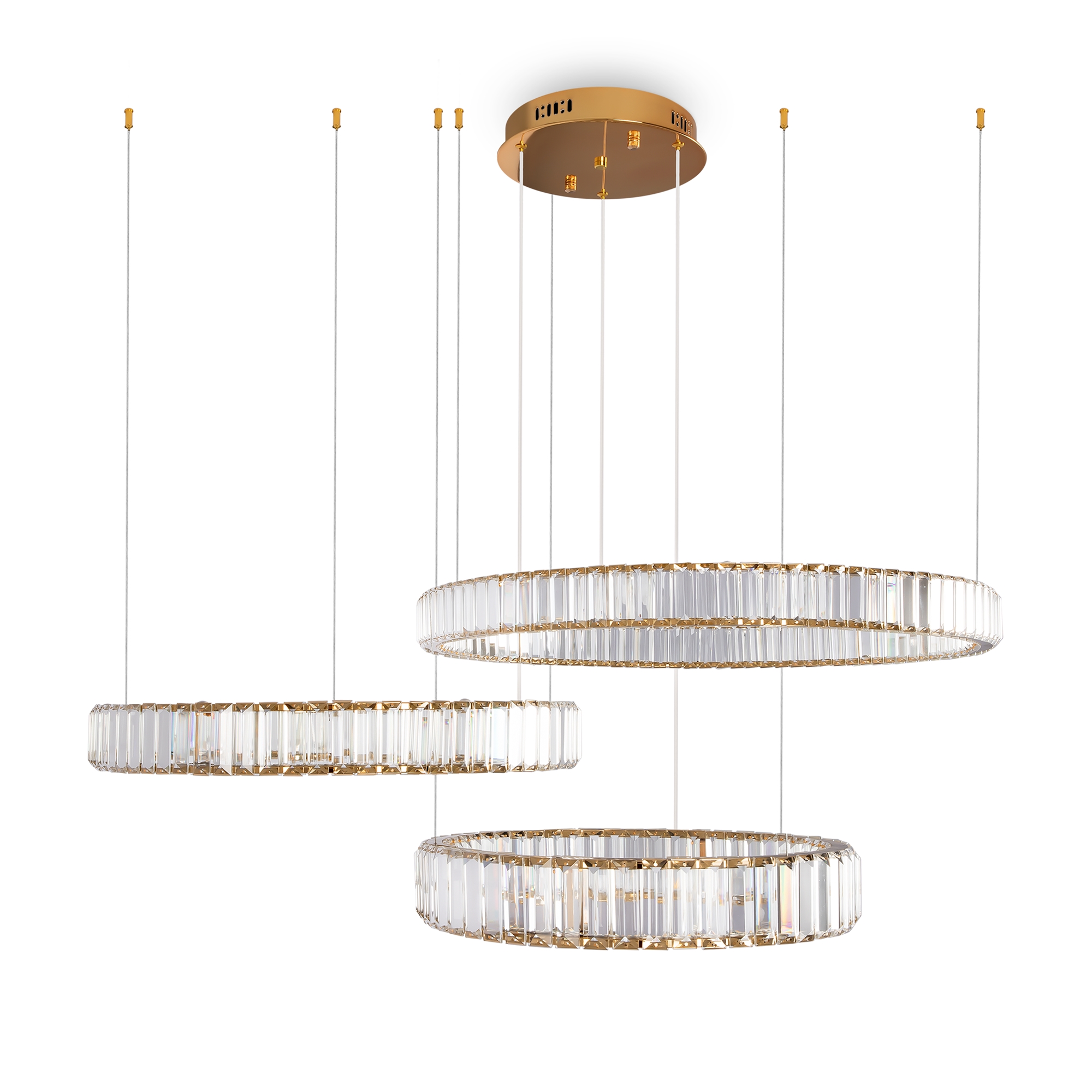 Металлическая арматура в цвете латунь и хром. Хрустальные декоративные кольца с геометричными гранями. LED-источник света. Регулировка цветовой температуры (3000-4000-5000K) и яркости 4G-dimming при помощи пульта (в комплекте).