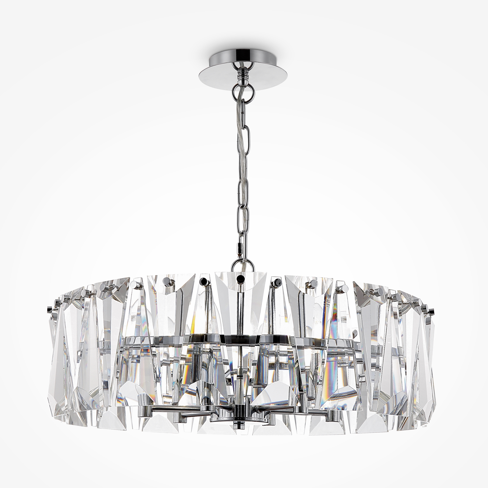 Материал арматуры – металл, оттенки – хром и золото. Декор – массивные крис таллы сложной огранки. Высота подвесных моделей регулируется длиной цепи. Источник света — лампа с цоколем Е14.