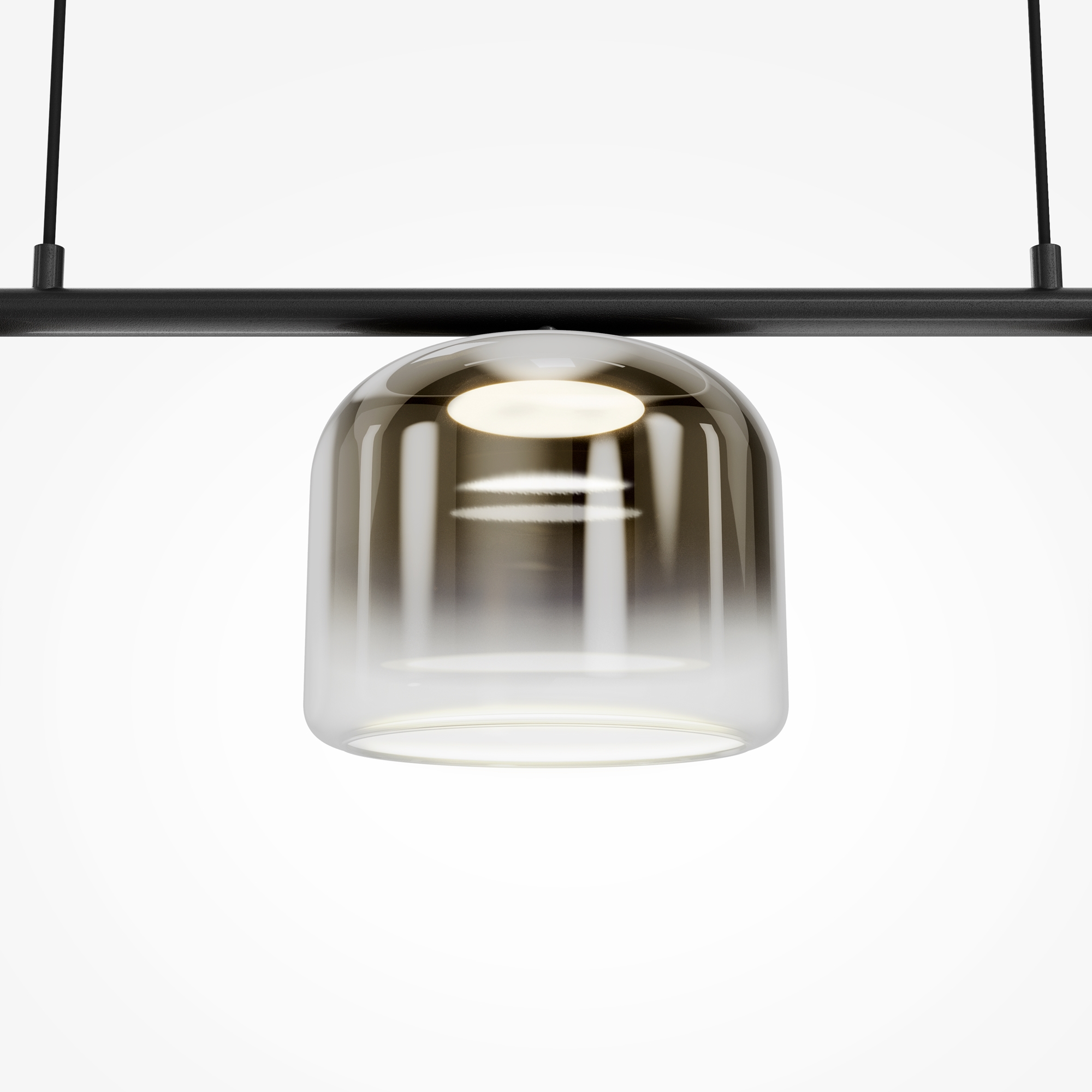 Материал арматуры и плафонов — литое стекло, цвет — градиентный черный, золотой и белый. Фактура поверхностей гладкая. Источник света: LED. Цветовая температура светильника 3000К, угол рассеивания света 120°. На проводе расположен тач-сенсор, при длительном нажатии световой поток меняет свою мощность (диммируется). Отражаясь от стекла, свет стремится вниз, создавая визуальный эффект парения плафона в воздухе.