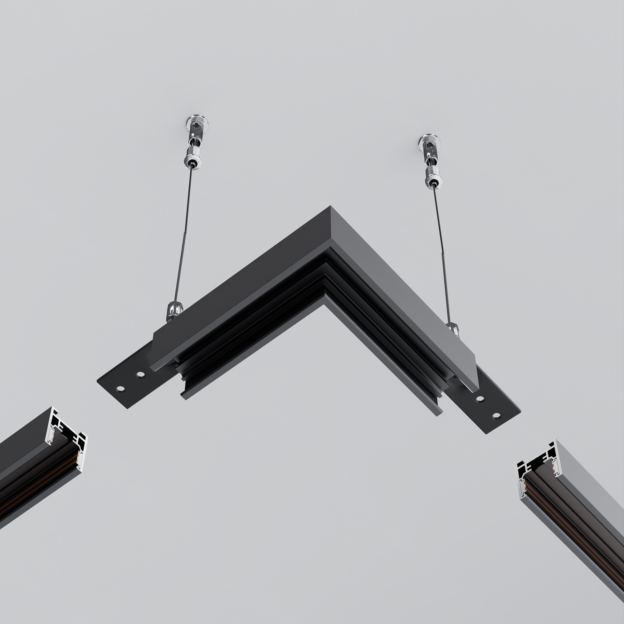 Комплектующие для низковольтной магнитной трековой системы Exility в черном и белом цветах. Разнообразие аксессуаров позволяет собрать свою уникальную конструкцию для накладного монтажа, подвесного, встраиваемого под гипсокартон и встраиваемого в натяжные потолки.