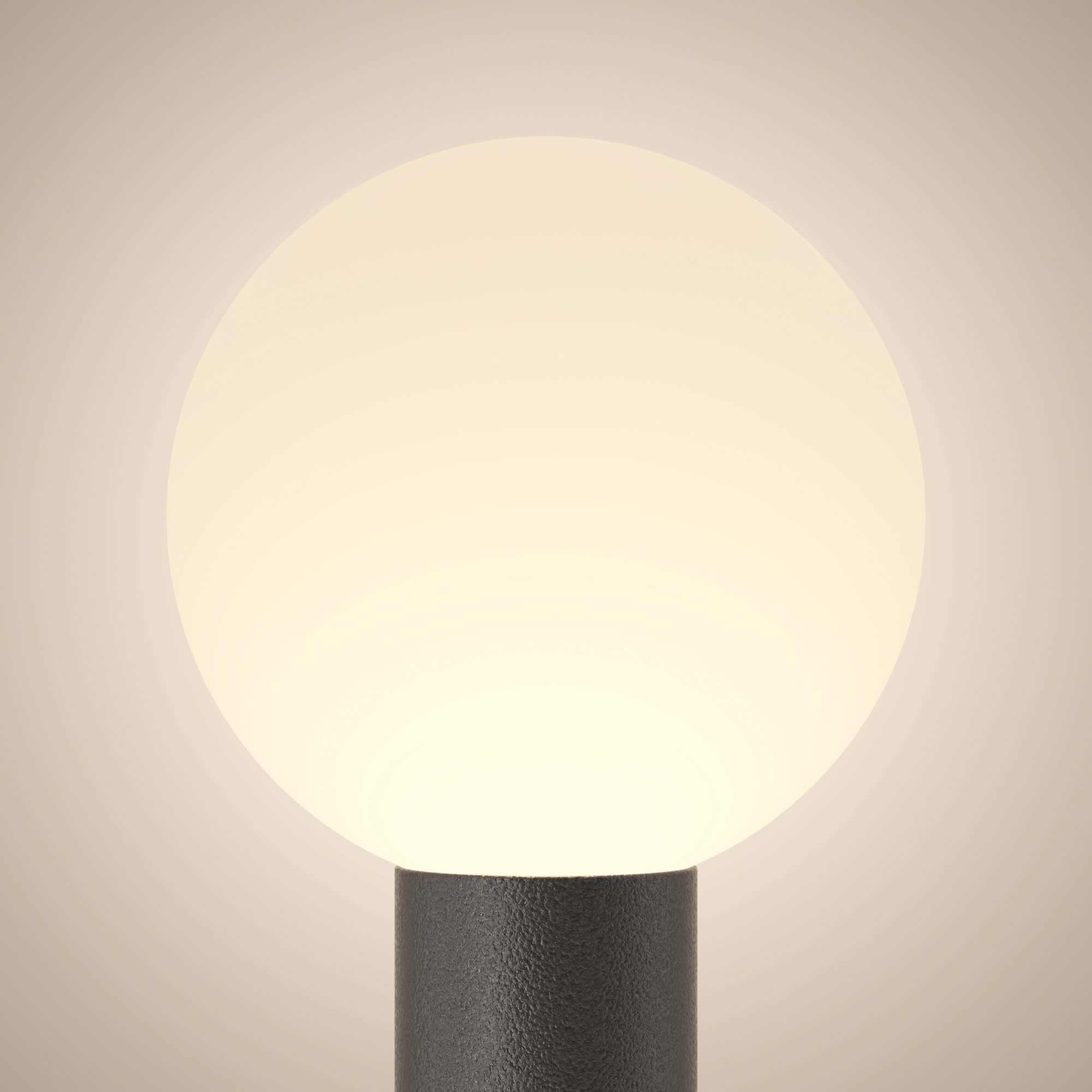 Алюминиевый корпус. Оттенки — черный, серый. Сферические плафоны из белого матового стекла. Защита от коррозии и перападов температур. Высокая степень защиты — IP 54. Источник света — лампа с цоколем E27.