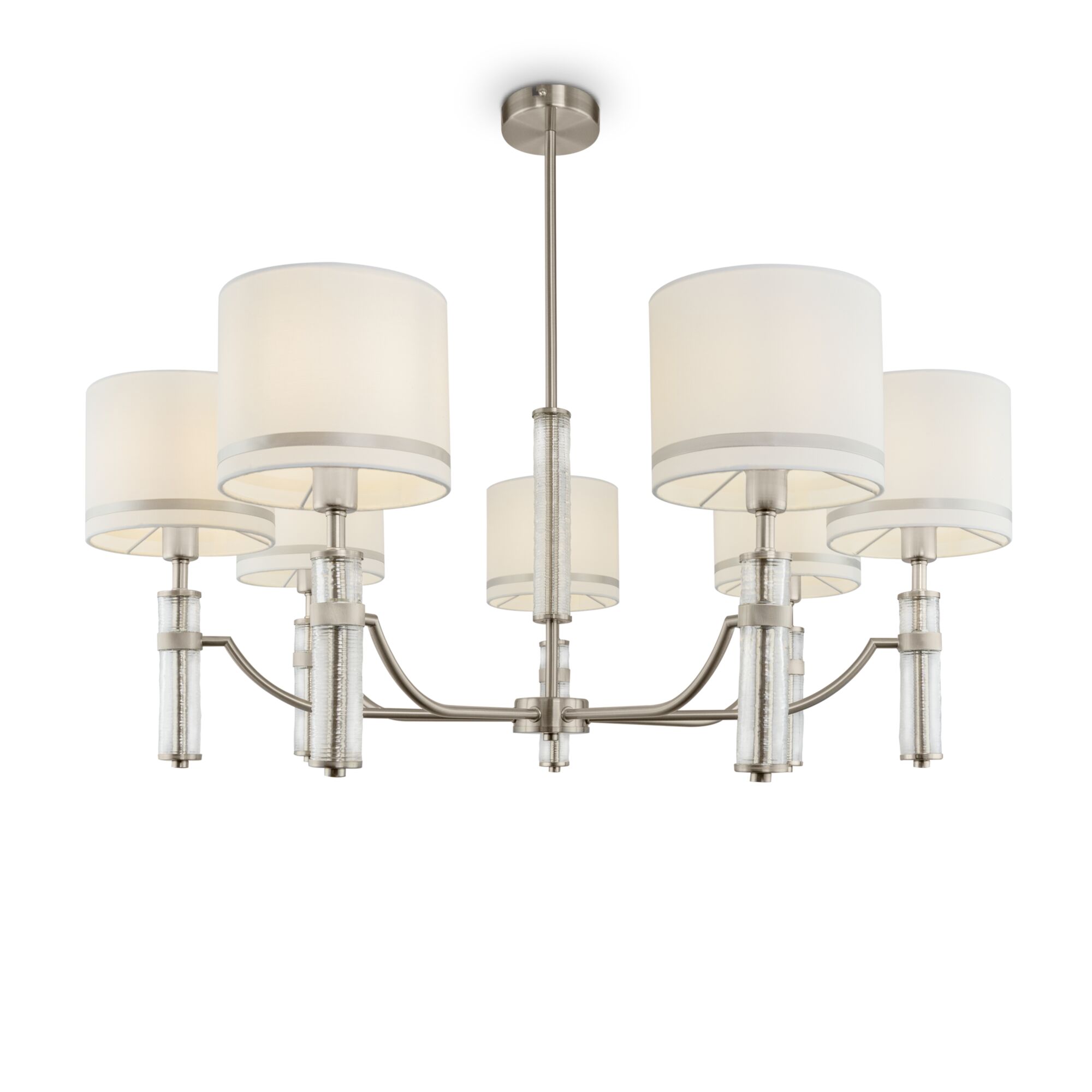Эстетика неоклассицизма объединила светильники серии Albero – люстру на 7/5 ламп, бра и настольную лампу. Металлическая арматура цвета никеля подчеркнута оригинальным цилиндрическим декором из рельефного стекла – за счёт этого создается ощущение невесомости и легкости конструкции. Кремовые тканевые абажуры, обрамленные кантом, венчают композицию, придавая ей завершенный вид и даря мягкий, слегка приглушенный свет. Регулируемый подвес позволяет настроить оптимальную высоту люстры в зависимости от параметров помещения. Широкий выбор светильников в серии дарит возможность организовать комплексное, многоуровневое освещение в единой выдержанной стилистике.