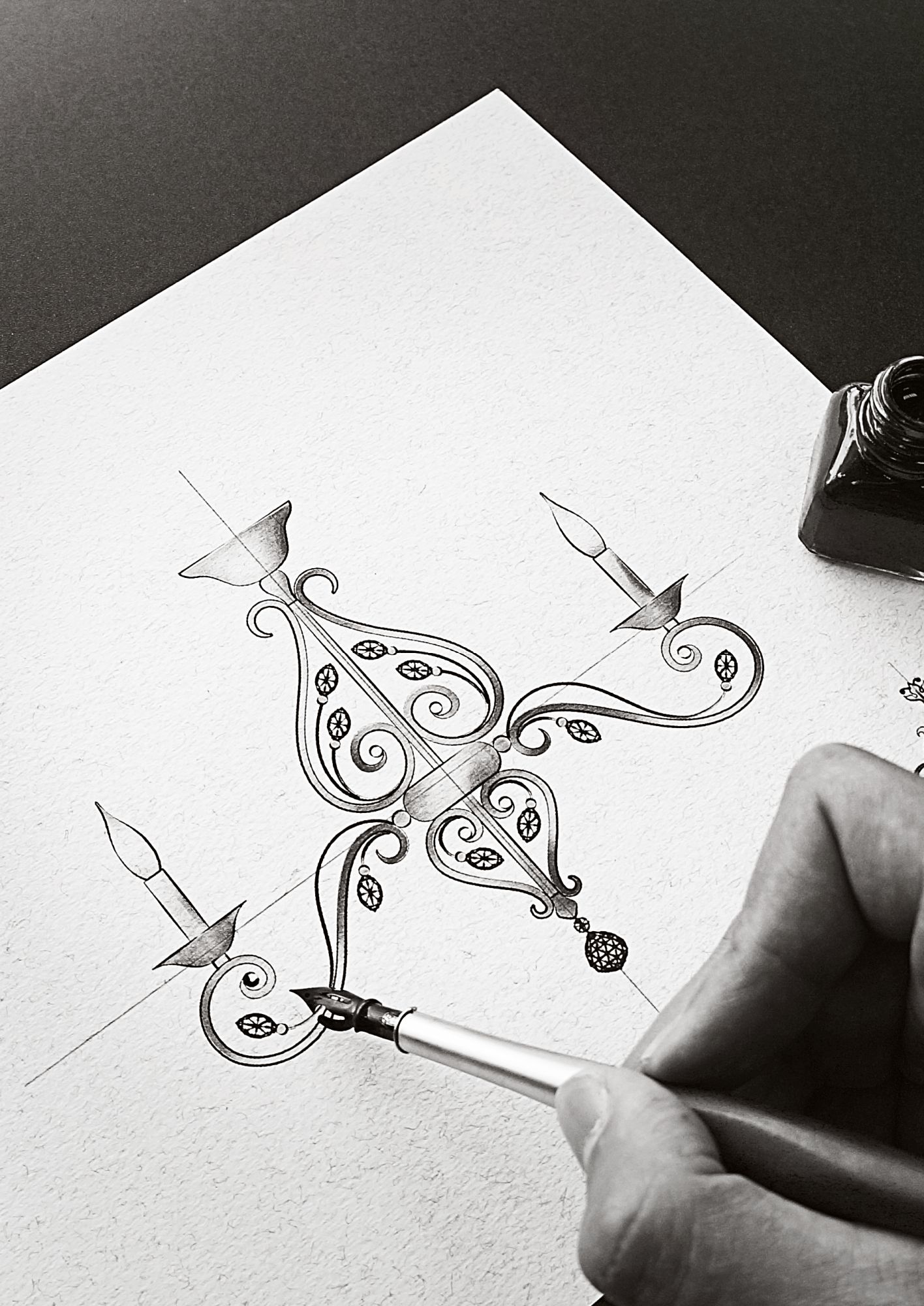 Флористическая тематика прослеживается в декоративных элементах и силуэтах светильников серии. Изящные витиеватые линии каркаса украшены граненными кристаллами в форме лепестков. Арматура изготовлена из металла бронзового цвета. Блюдца на рожках имеют небольшие просечные отверстия, через которые проходит свет ламп, выявляя ажурный контур. Высоту люстр возможно изменять, регулируя длину цепи.