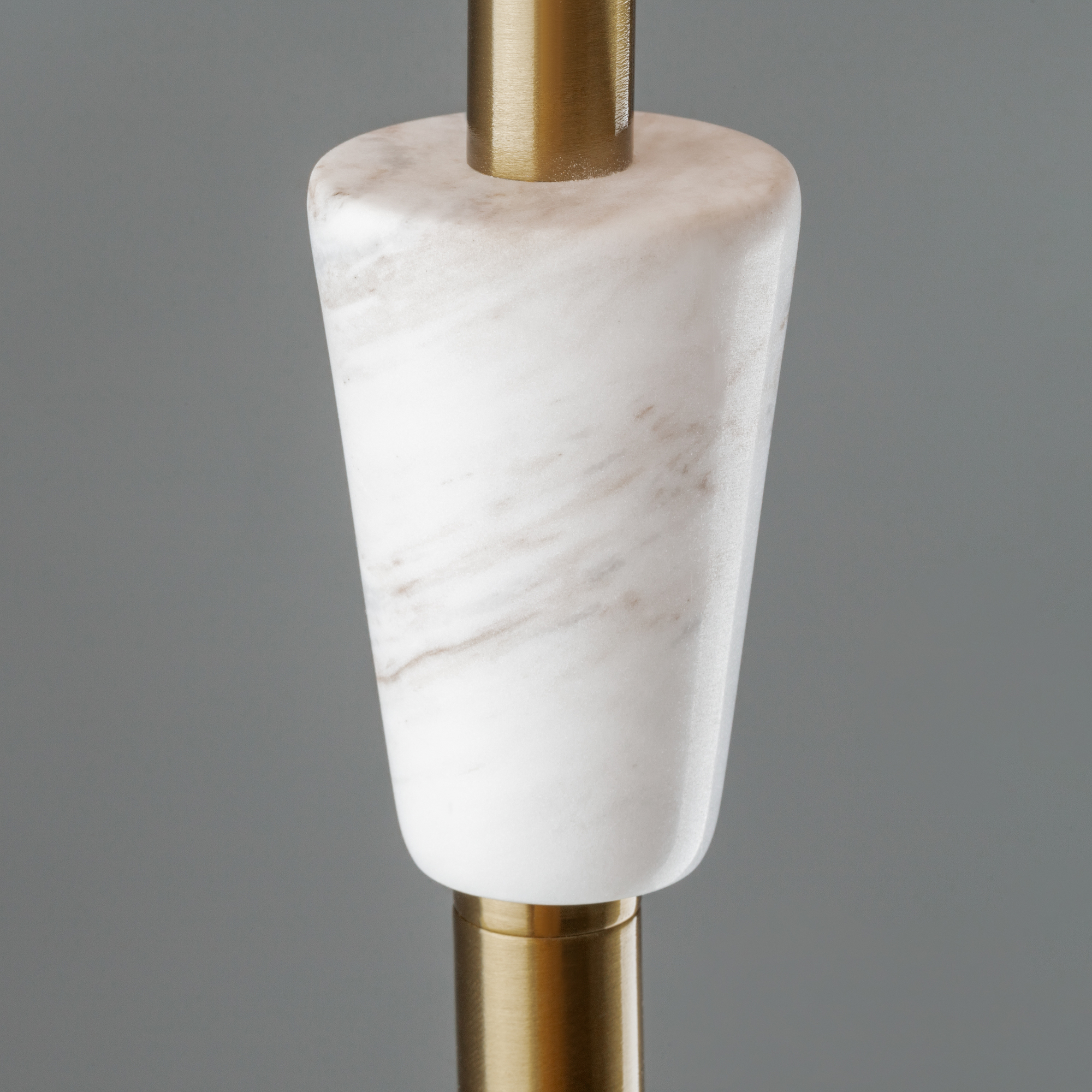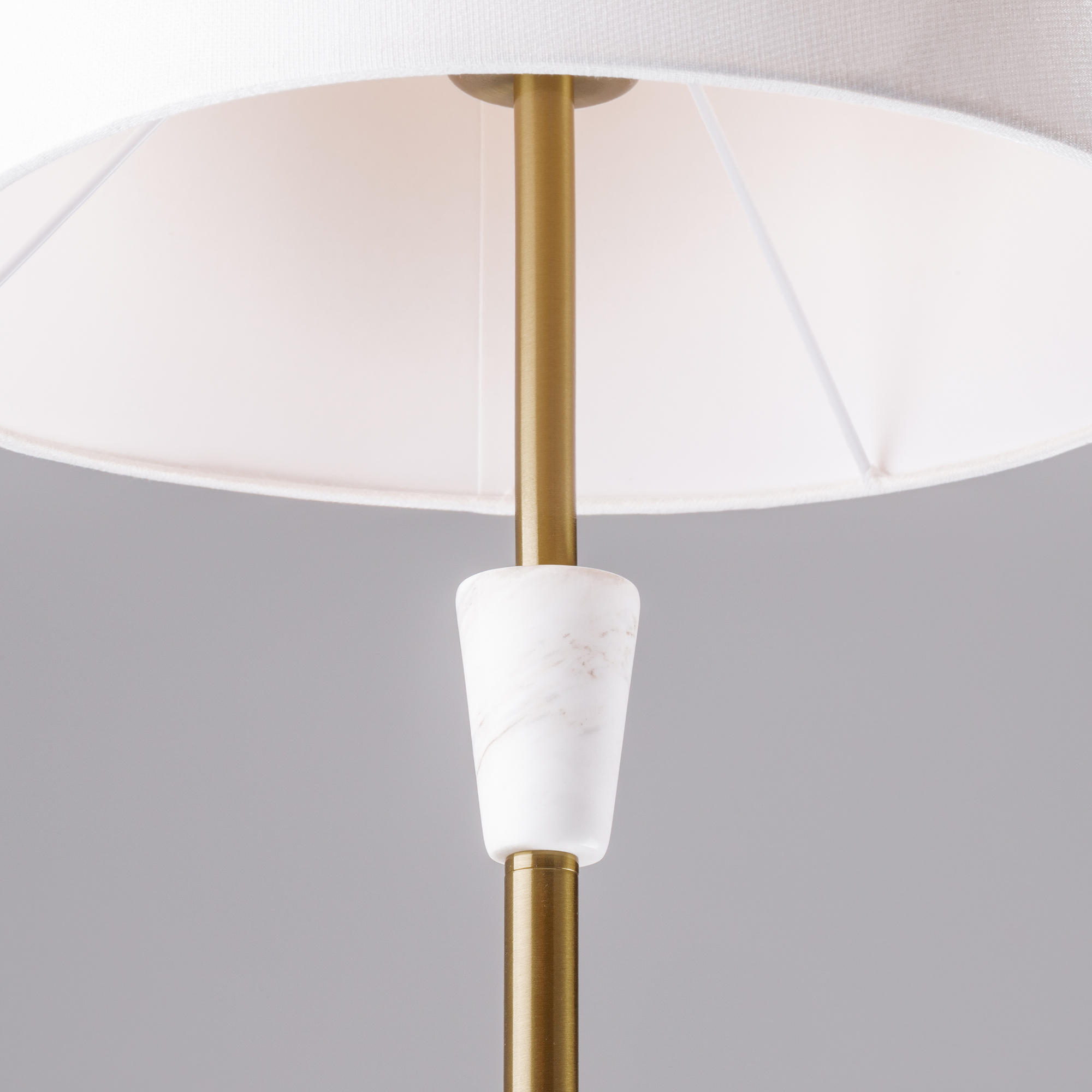 Металлическая арматура в цвете латунь. Дополнительные элементы — минималистичные вставки из натурального белого мрамора. Белые абажуры из ткани в форме конуса. Источник света — лампа с цоколем Е14 или Е27.