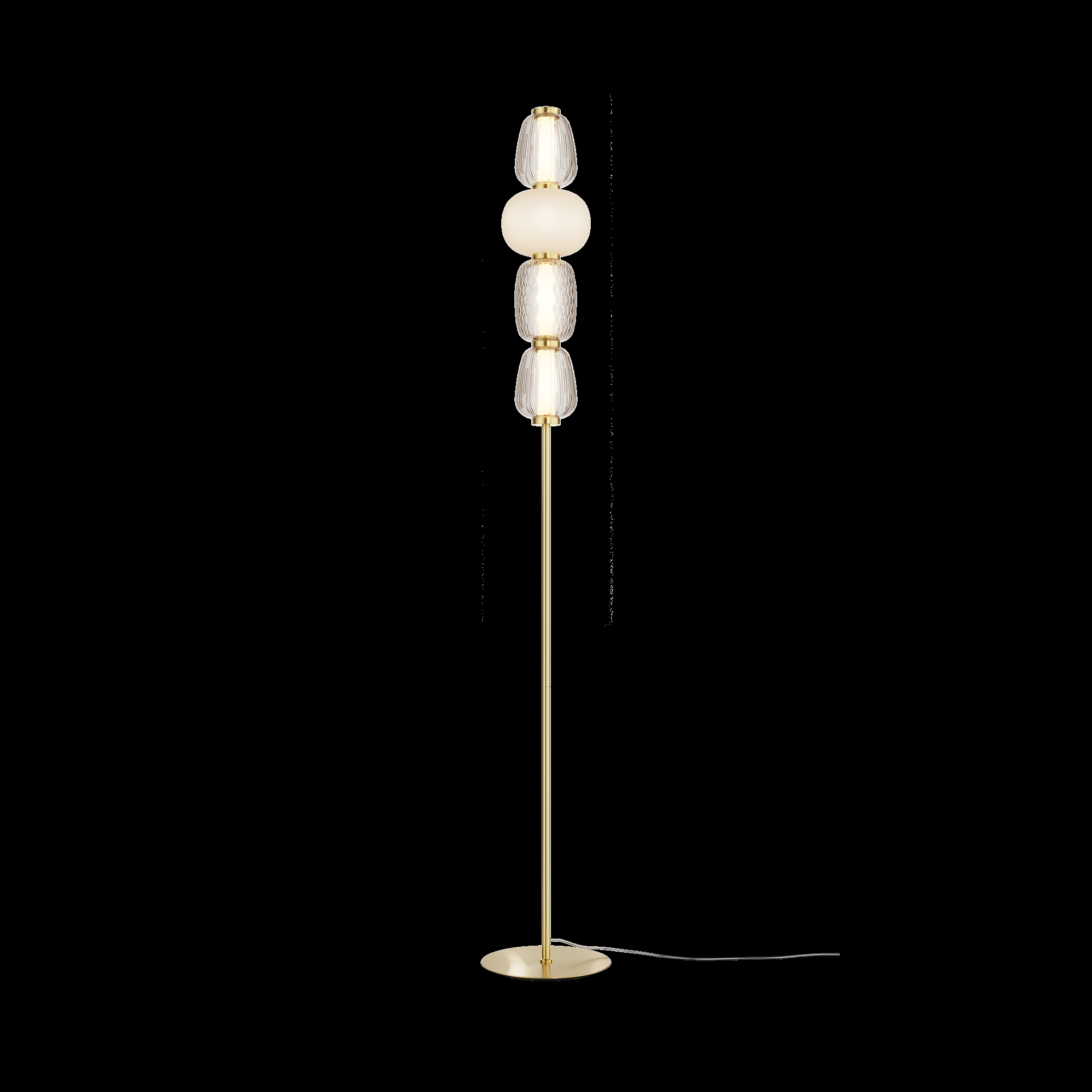Металлическая арматура, цвет — золото, хром. Микс плафонов округлых и вытянутых форм из белого матового и прозрачного стекла с сетчатым и с линейным повторяющимся рельефным рисунком. Регулируемая высота подвесных моделей, провод — 3 метра. LED-источник света, цветовая температура 3000К.
