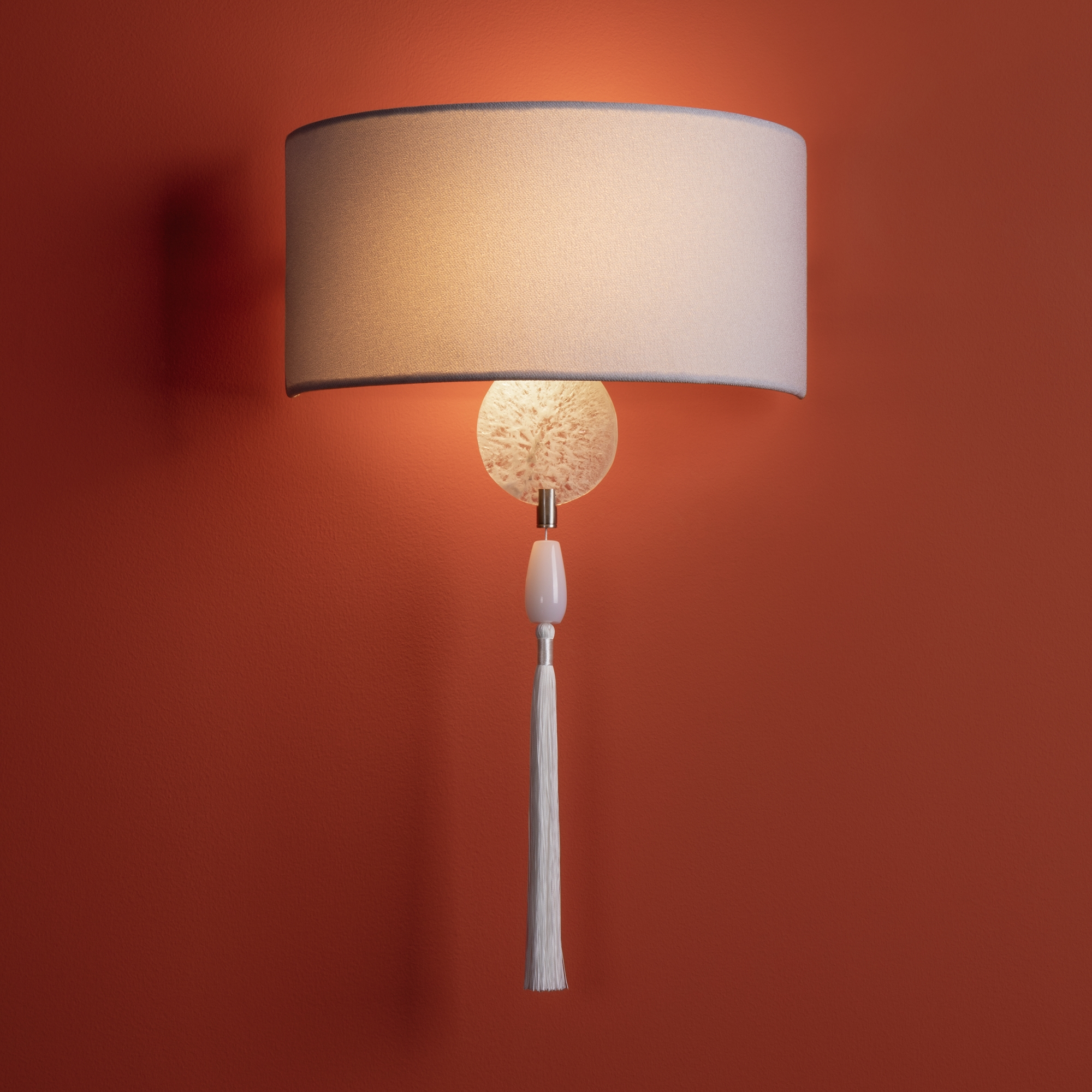 Металлическая арматура в цвете никель. Светильники с натуральным агатом, серым тканевым абажуром и декоративными кисточками . Лампы E14 (не в комплекте). Бра с регулируемой высотой.