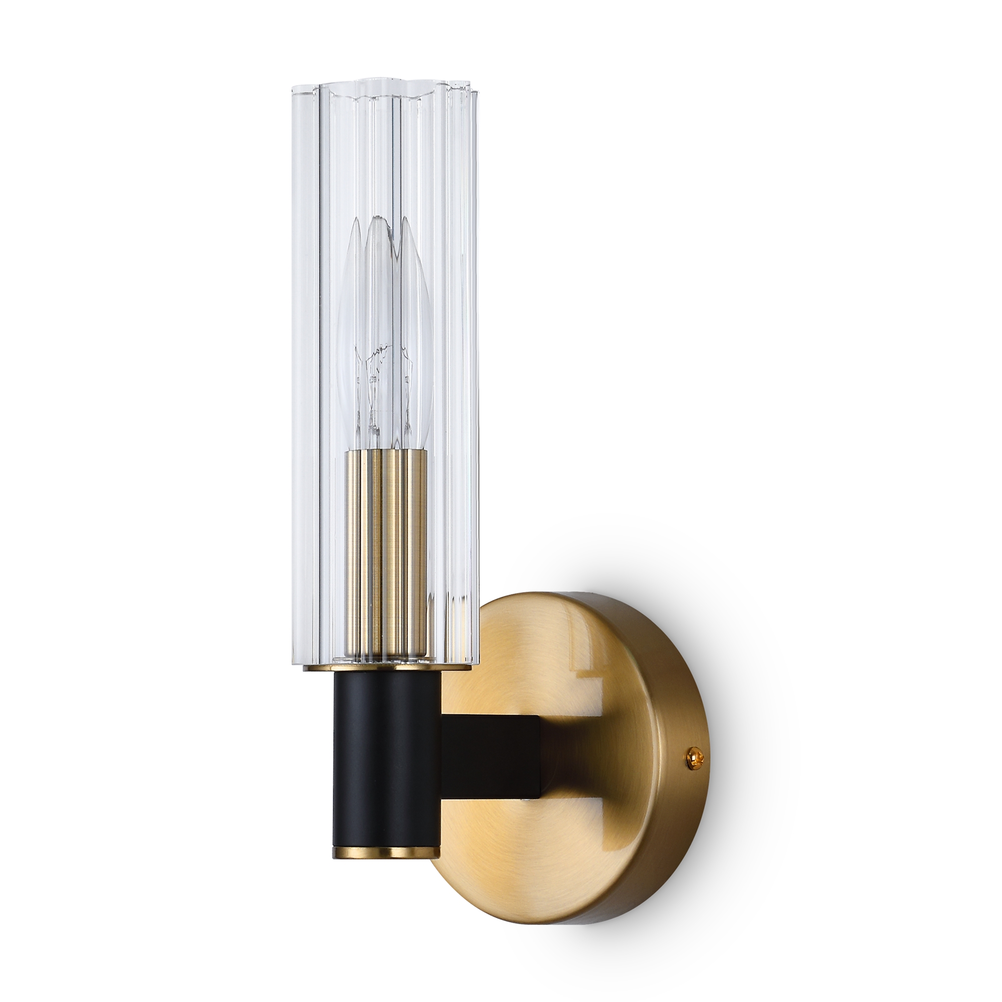 Арматура из металла сочетает два оттенка: черный и латунь. Плафоны цилиндрической формы выполнены из рельефного прозрачного стекла. Актуальная геометрия с настроением американской классики. Источник света – лампа с цоколем E14.