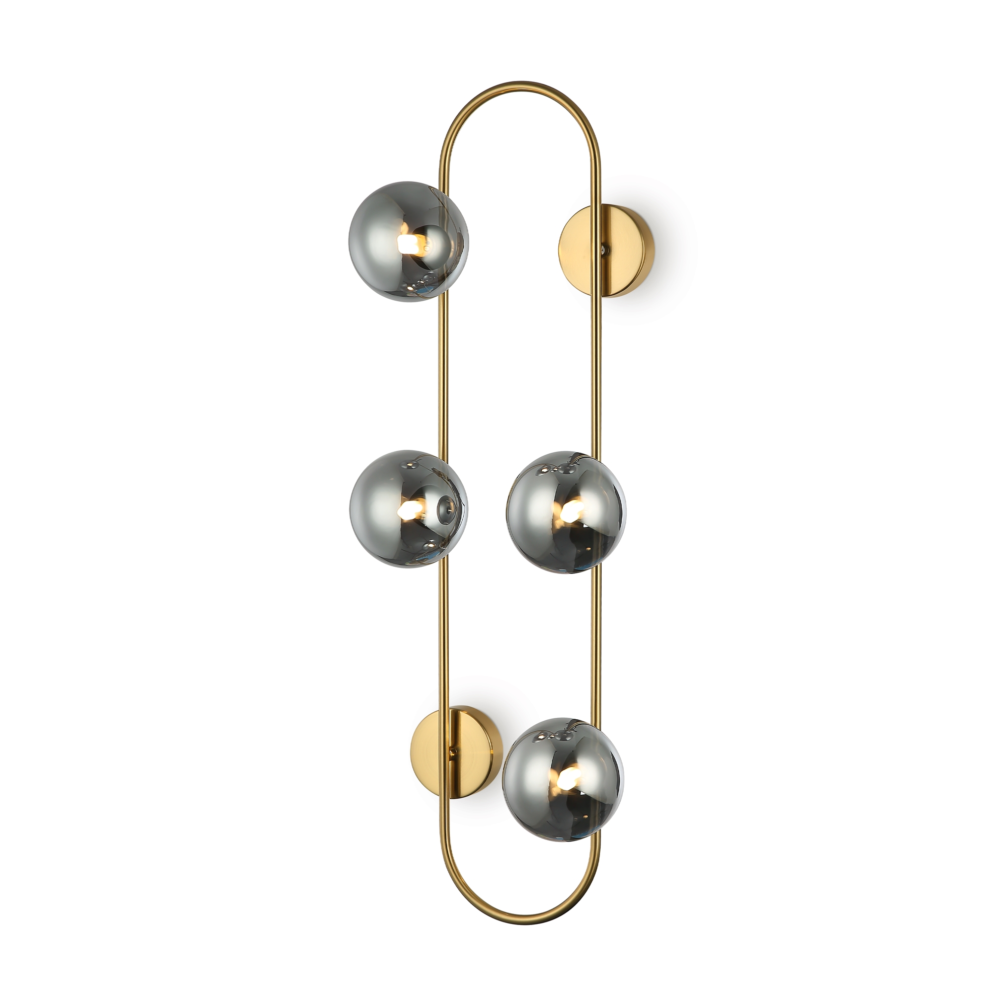 Арматура — металл, цвет — латунь. Стеклянные плафоны-сферы в двух оттенках белый матовый и дымчатый в настенно потолочной версии. Округлые и плавные линии — беспроигрышное сочетание для современных интерьеров. Настенные бра можно использовать как для общего на потолке так и для зонального настенного освещения Источник света — лампа с цоколем G9.