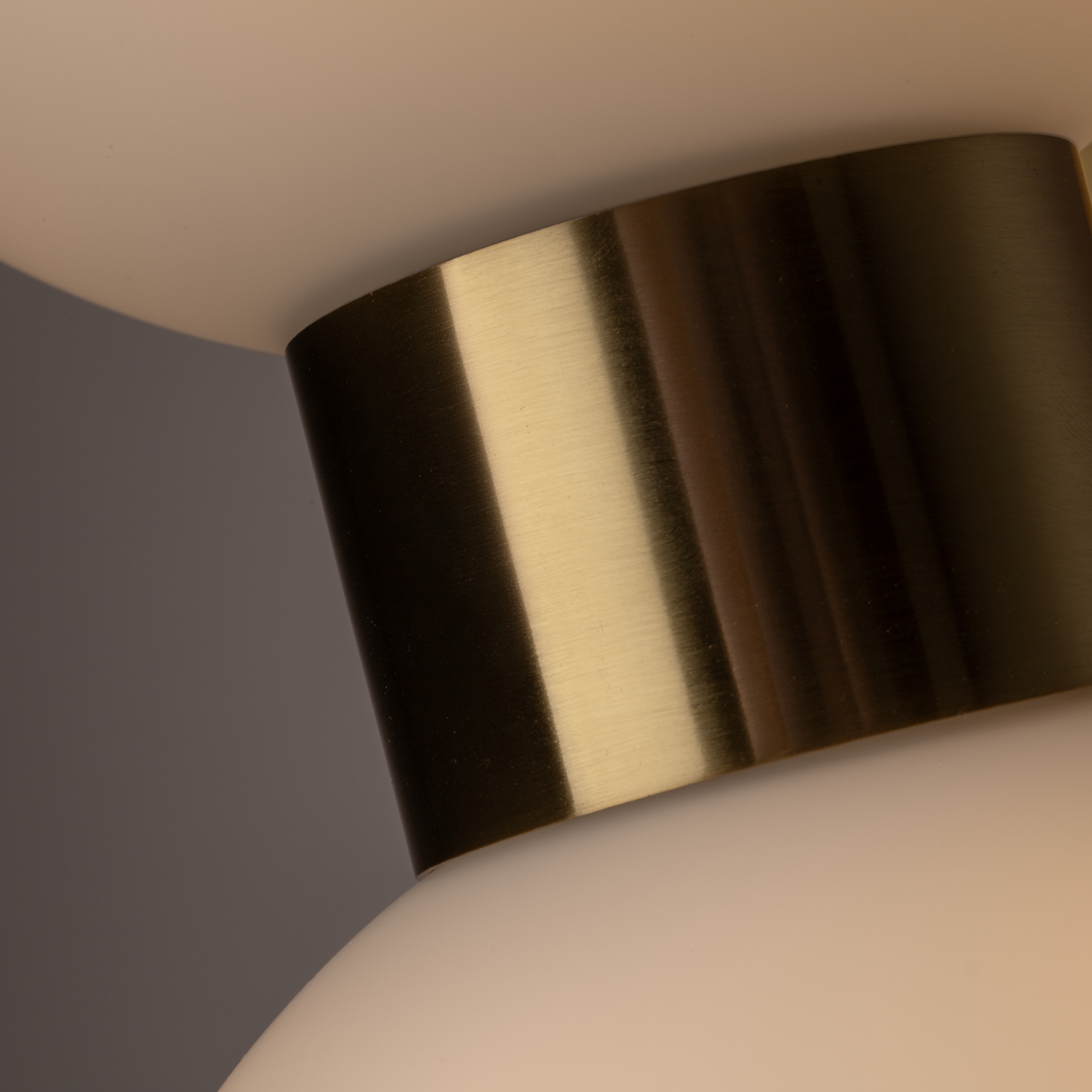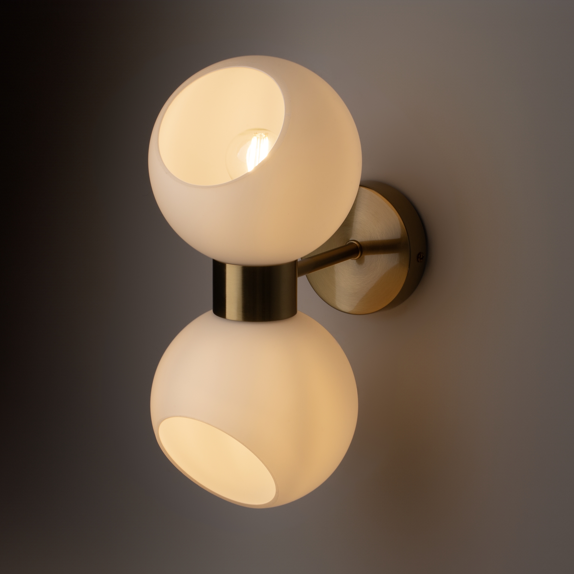 Металлическая арматура в цвете латунь. Открытые сферические плафоны в 2-х цветах: тёплый белый и тёмный гальванизированный. Плафоны разделены металлической вставкой в цвет арматуры. Источником света является лампа с цоколем G9. Для бра — цоколь Е27.