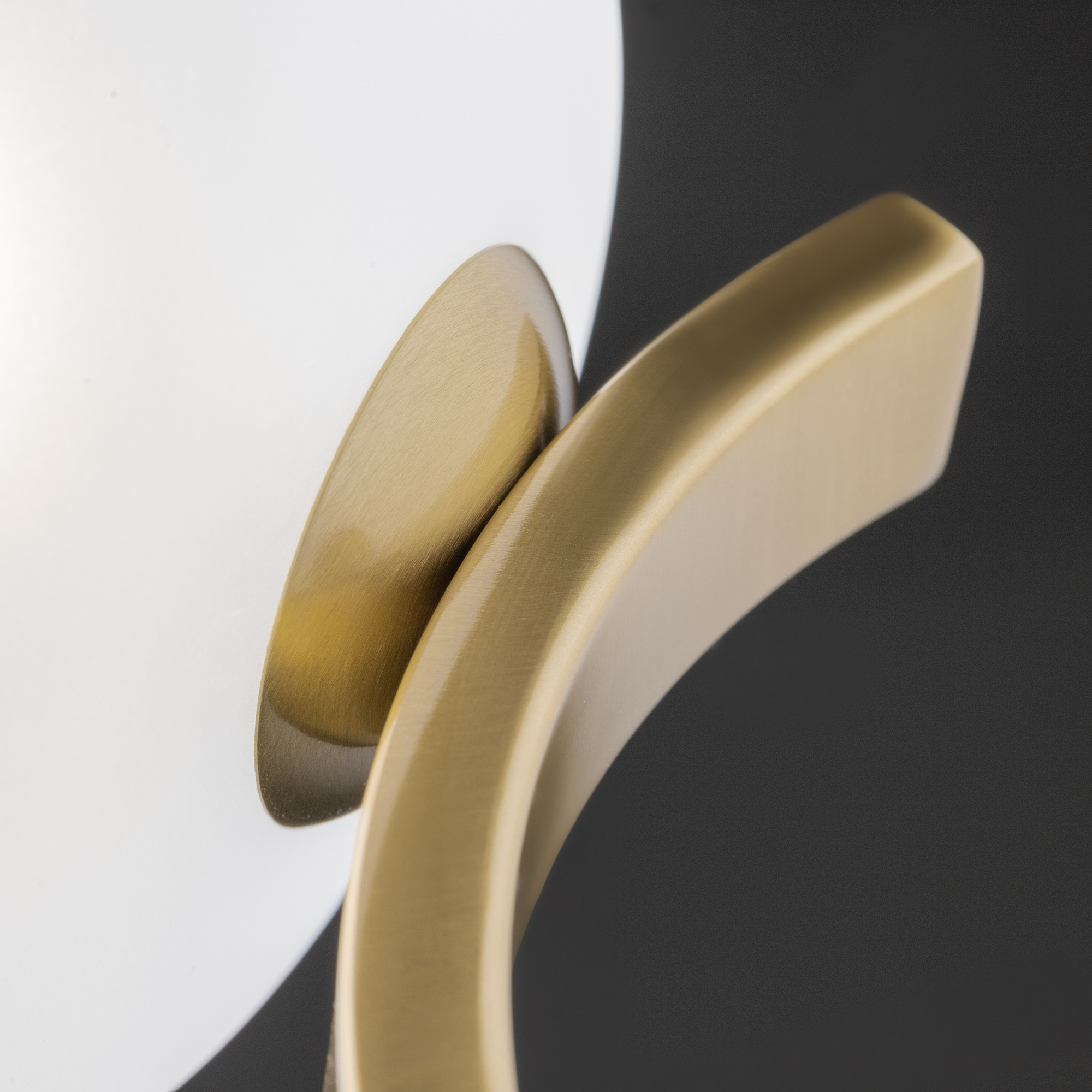 Арматура — металл. Цвет арматуры — латунь. Серия с необычной формой плафонов — немного приплюснутые, матовые белые. Настольные лампы и настенные бра выгнутой формы. Источник света лампа. Цоколь G9.