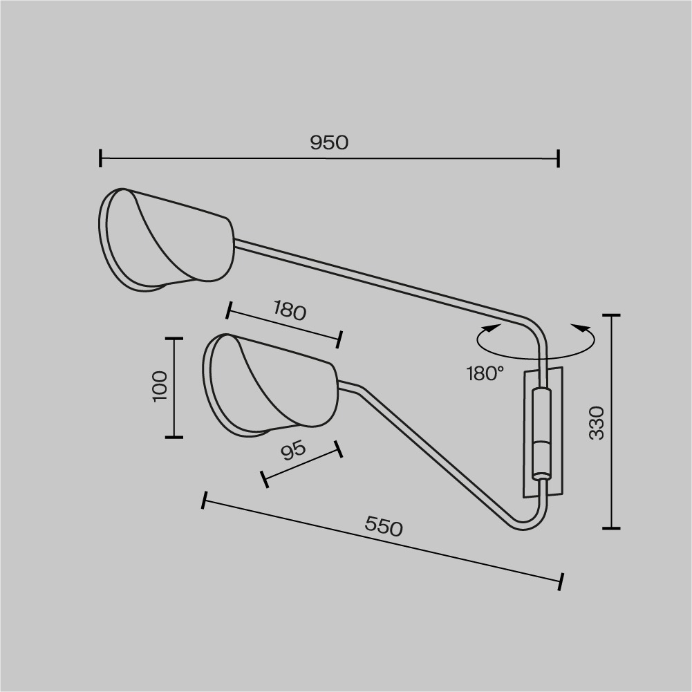 Арматура и плафоны из металла, цвет – черный. Оригинальная форма плафона с плавным контуром. Источники света скрыты под акриловым рассеивателем.