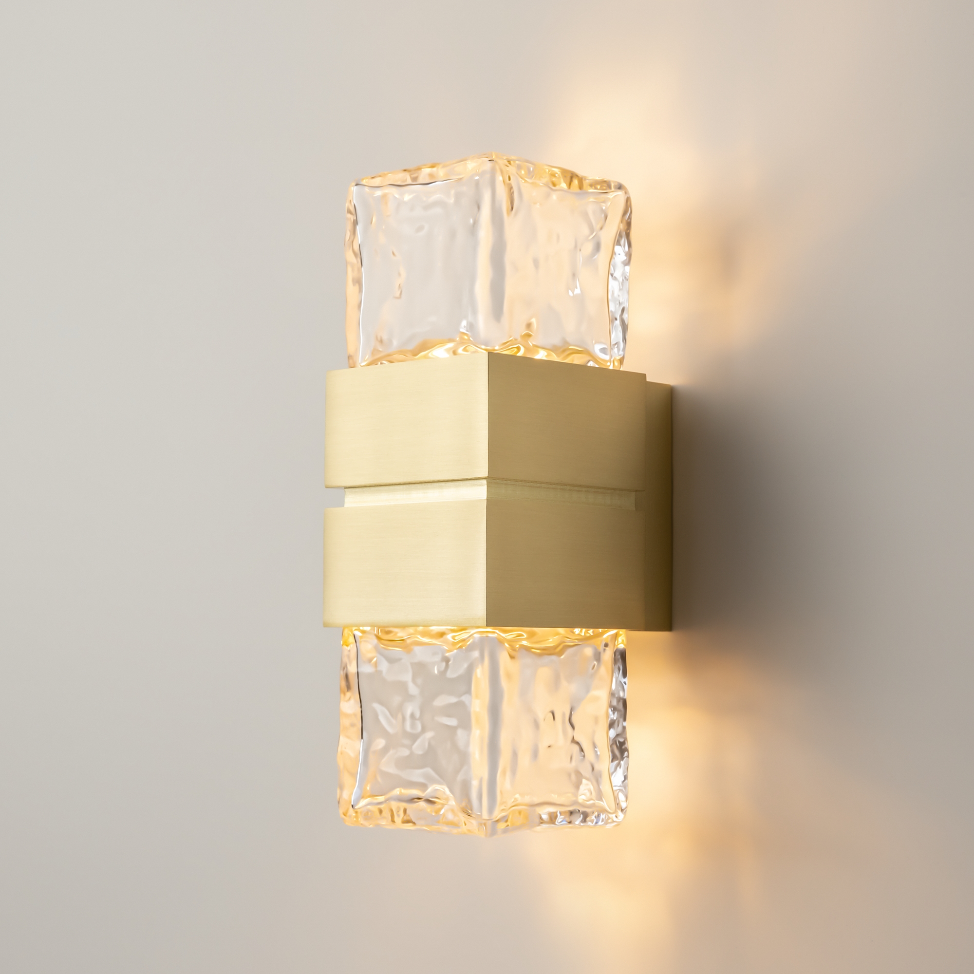 Дизайн серии воплощает хрупкую красоту и загадочное сияние арктических пейзажей. Трендовая массивная арматура выполнена из металла в цвете сатинированной латуни. Геометрический силуэт. Плафоны изготовлены из «мятого» стекла ручной работы, что обеспечивает уникальный световой рисунок на поверхностях. Встроенный LED-источник света с цветовой температурой 3000K создает теплое и уютное освещение. Светильник предназначен для интерьеров премиум-класса: спален, гостиных и офисов.