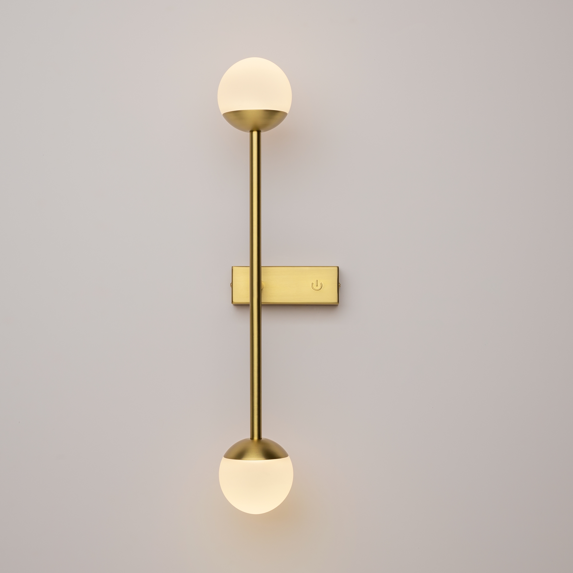 Материал арматуры — металл, цвета — латунь, черный. Плафоны-сферы из белого матового стекла. LED источник света, цветовая температура 3000К. Встроенный выключатель регулирует яркость света прикосновением с шагом 25%, 50%, 75% и 100%.