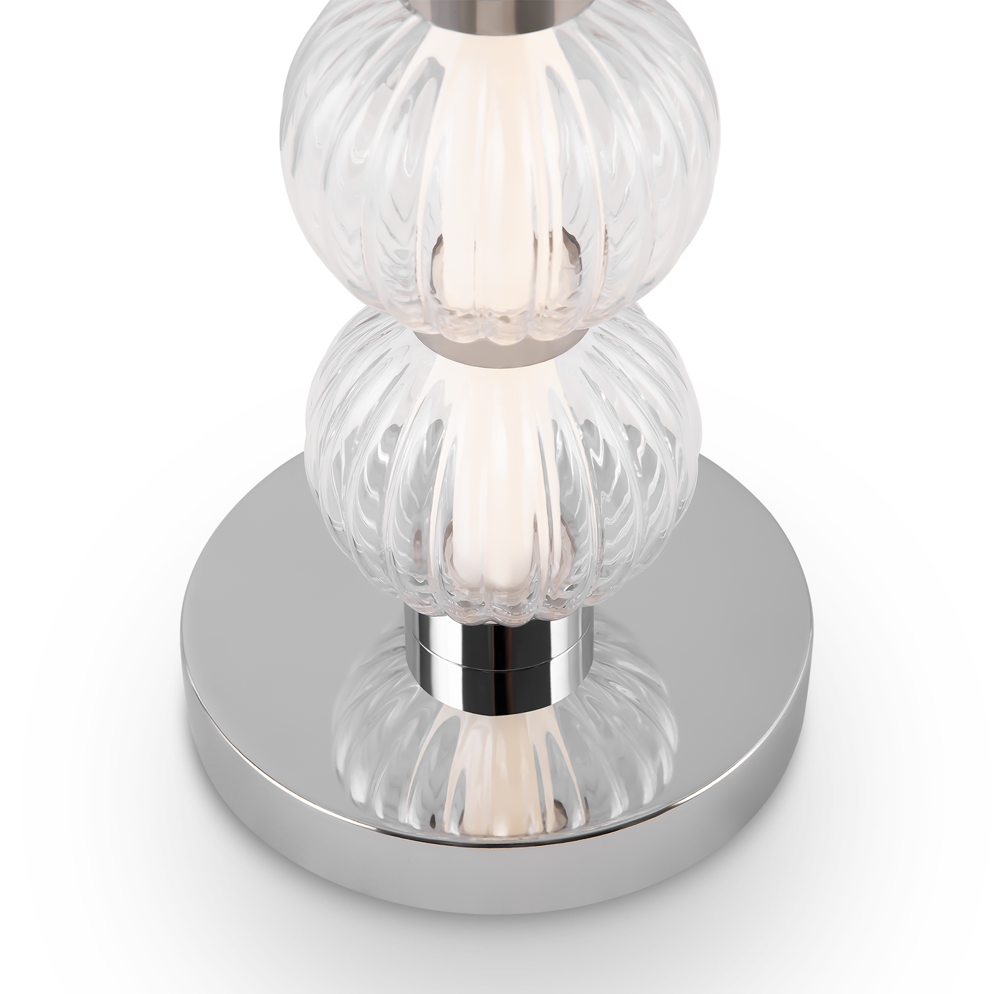 Арматура из металла, цвет – хром. Акцентный декор в виде рельефных сфер из литого стекла. Источник света – светодиодная лента – скрыта под акриловым рассеивателем. Регулируемая высота подвесных светильников.