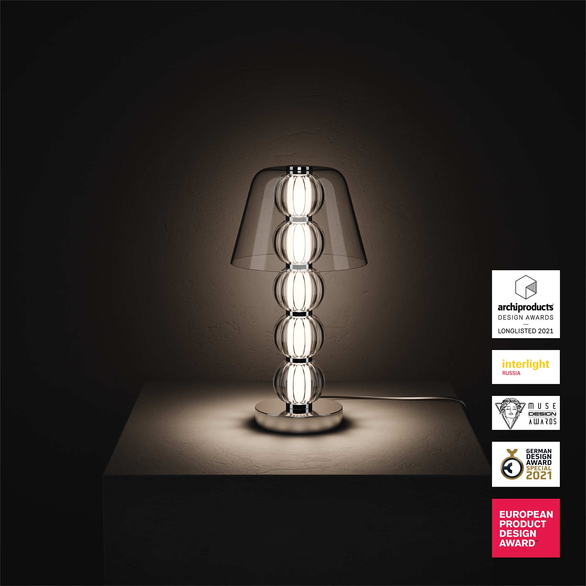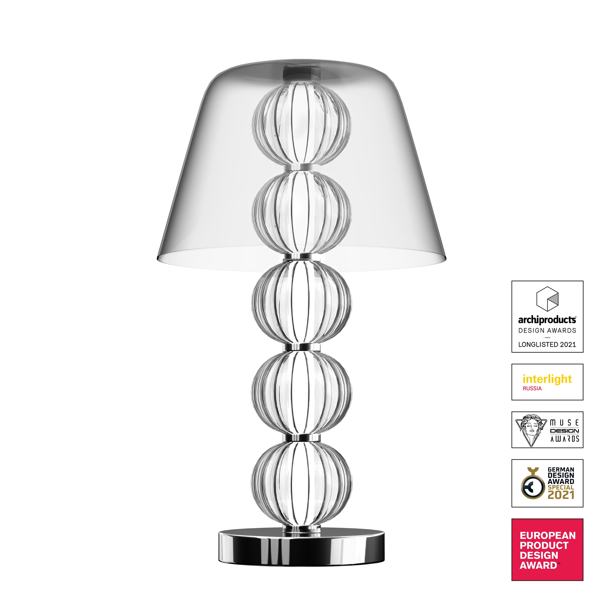 Арматура из металла, цвет – хром. Акцентный декор в виде рельефных сфер из литого стекла. Источник света – светодиодная лента – скрыта под акриловым рассеивателем. Регулируемая высота подвесных светильников.