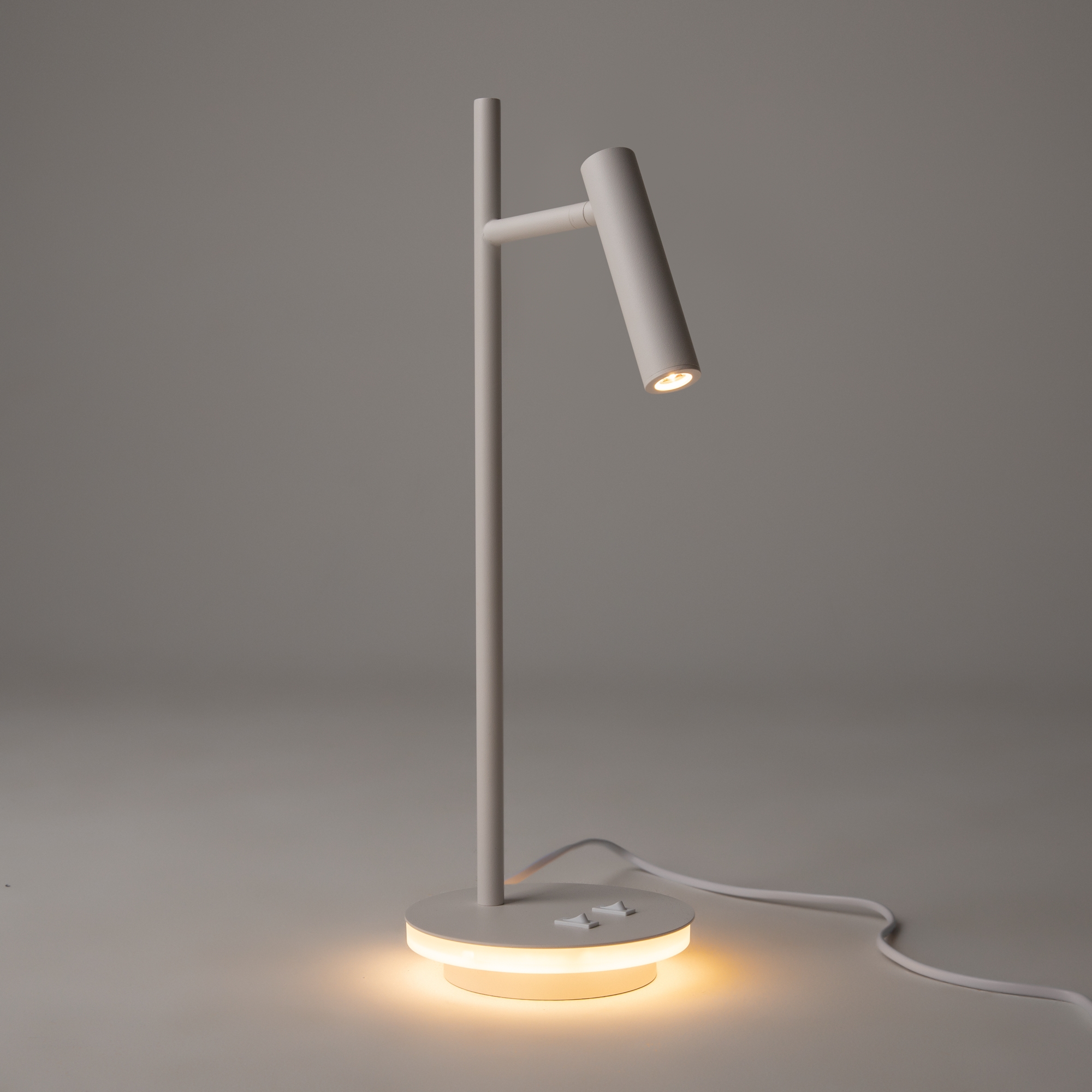 Металлический корпус в черном и белом оттенках. Вращающийся плафон-цилиндр позволяет регулировать направление светового потока. Декоративная подсветка основания. LED источник света, цветовая температура 3000К.