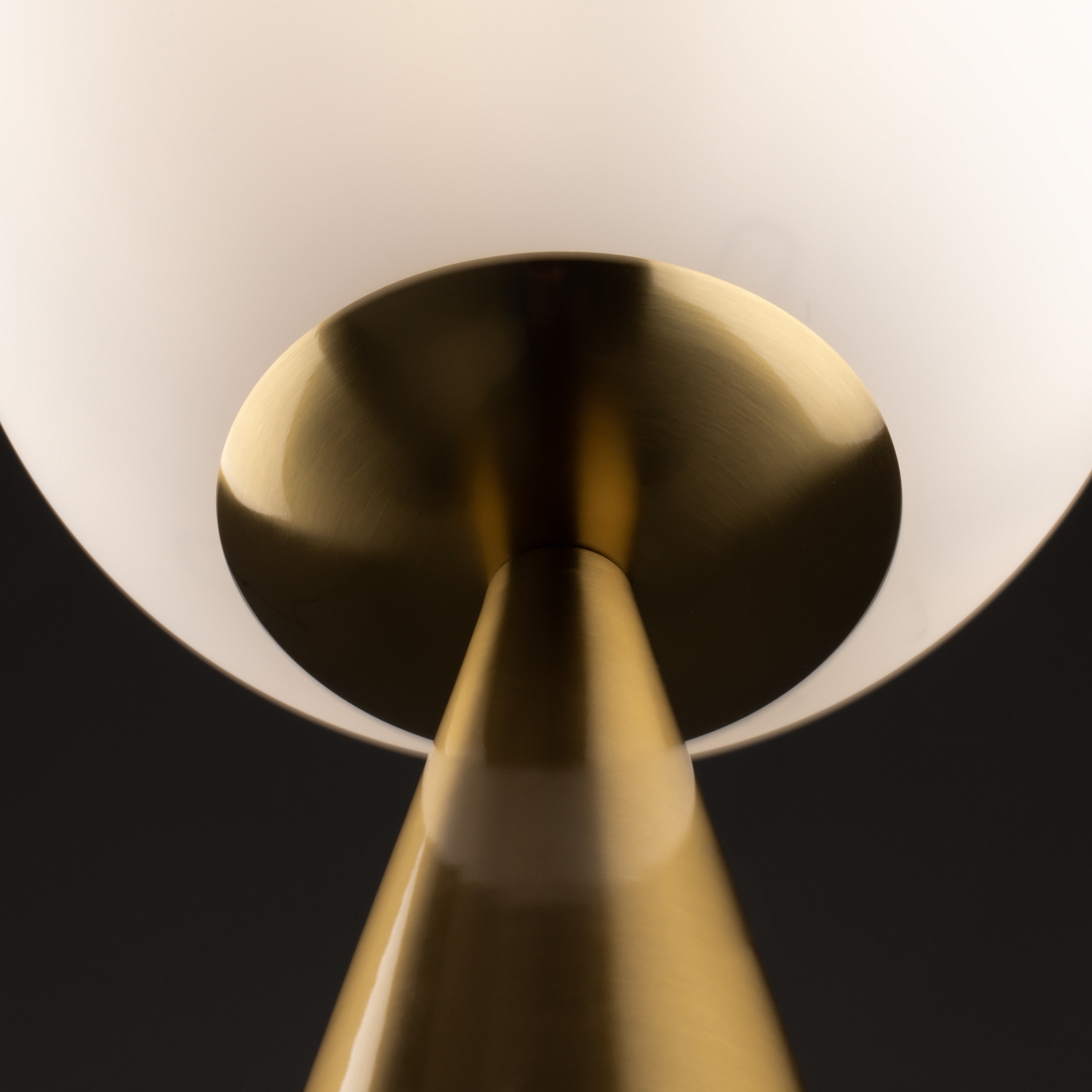 Материал арматуры — металл, цвета — латунь, черный. Плафон-сфера из белого матового цвета. Функция Touch позволяет включать и выключать свет. Источник света — лампа с цоколем Е14.