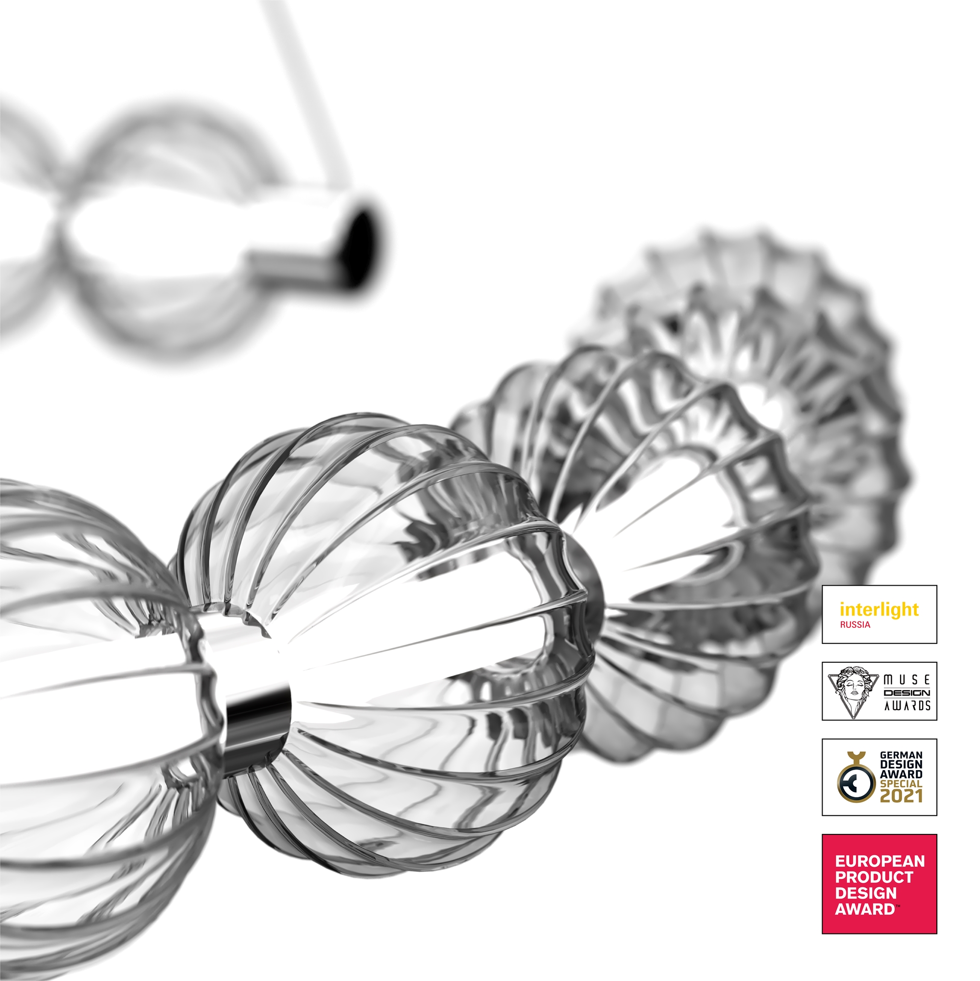Арматура из металла, цвет – хром. Акцентный декор в виде рельефных сфер из литого стекла. Источник света – светодиодная лента – скрыта под акриловым рассеивателем. Регулируемая высота подвесных светильников.