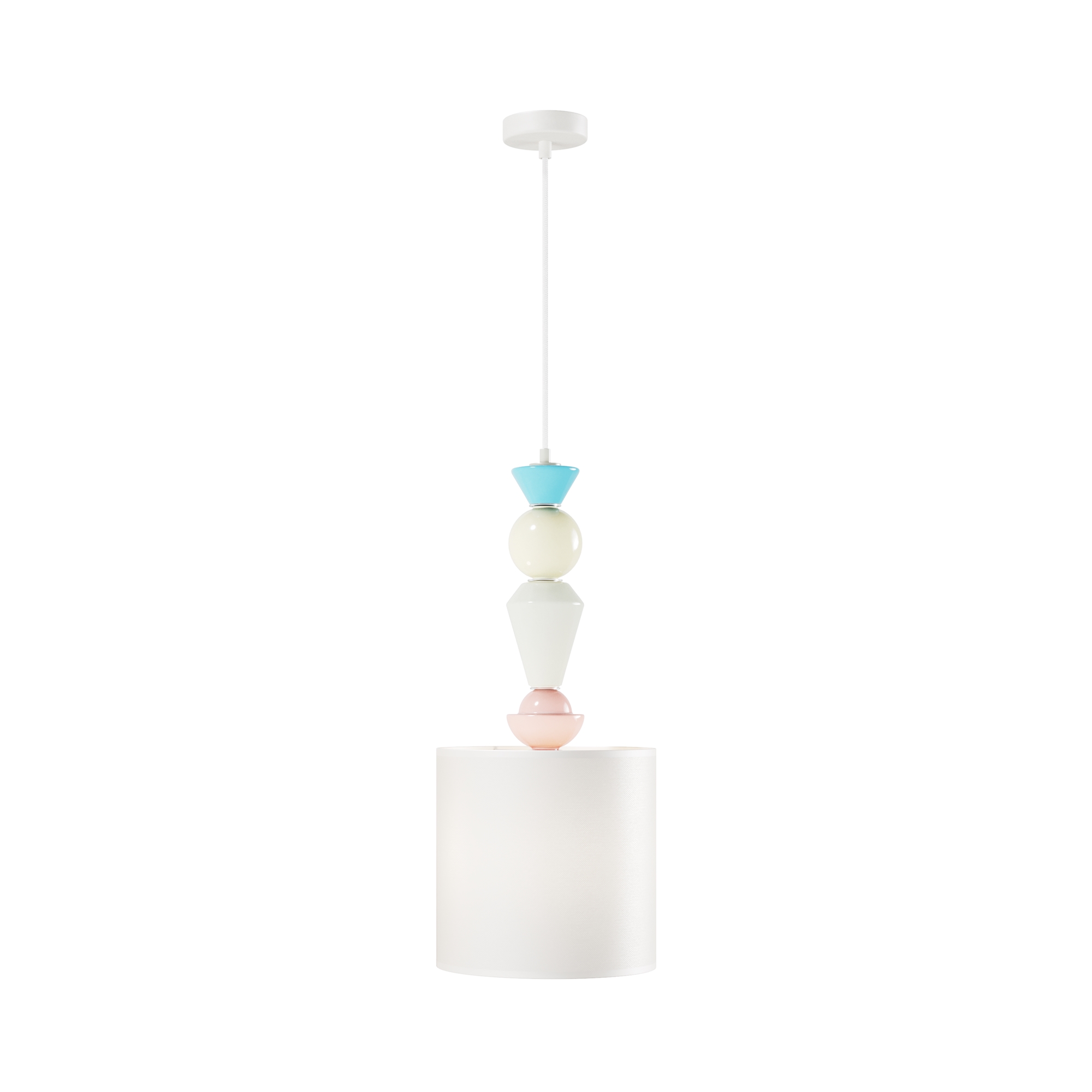 Арматура из металла, цвет — белый. Абажур выполнен из натуральной ткани, цветные декоративные элементы в пастельных тонах — из керамики. Белый абажур имеет классическую цилиндрическую форму, ткань дает мягкий рассеянный свет. Светильники комплектуются сменными лампами с цоколем Е27 (не входят в комплект). Провод подвесного светильника можно регулировать по длине. Декор напоминает стилистику крафтового искусства