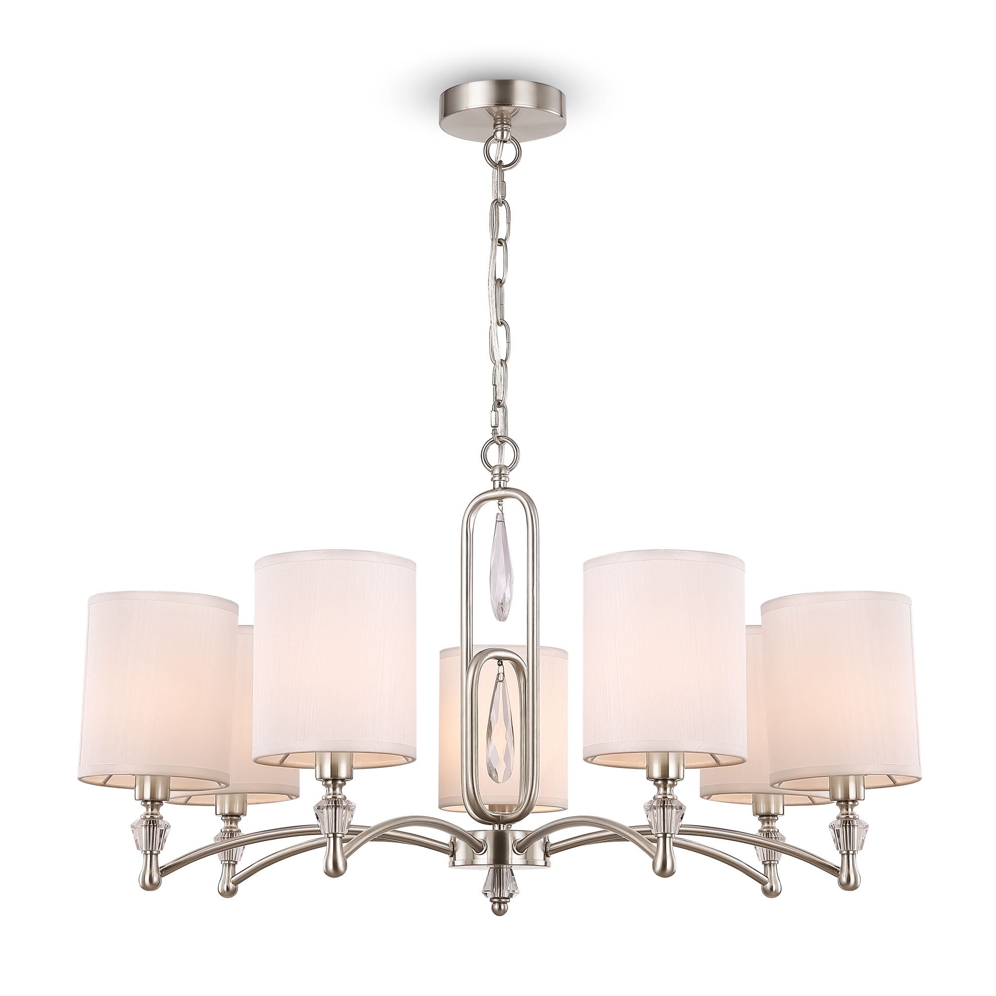 Материал арматуры – нержавеющая сталь, цвет – хром. Материал абажуров – текстиль на ПВХ, цвет – белый. Декор – прозрачное стекло. Акцентные стеклянные кристаллы на рожках со сложной огранкой.