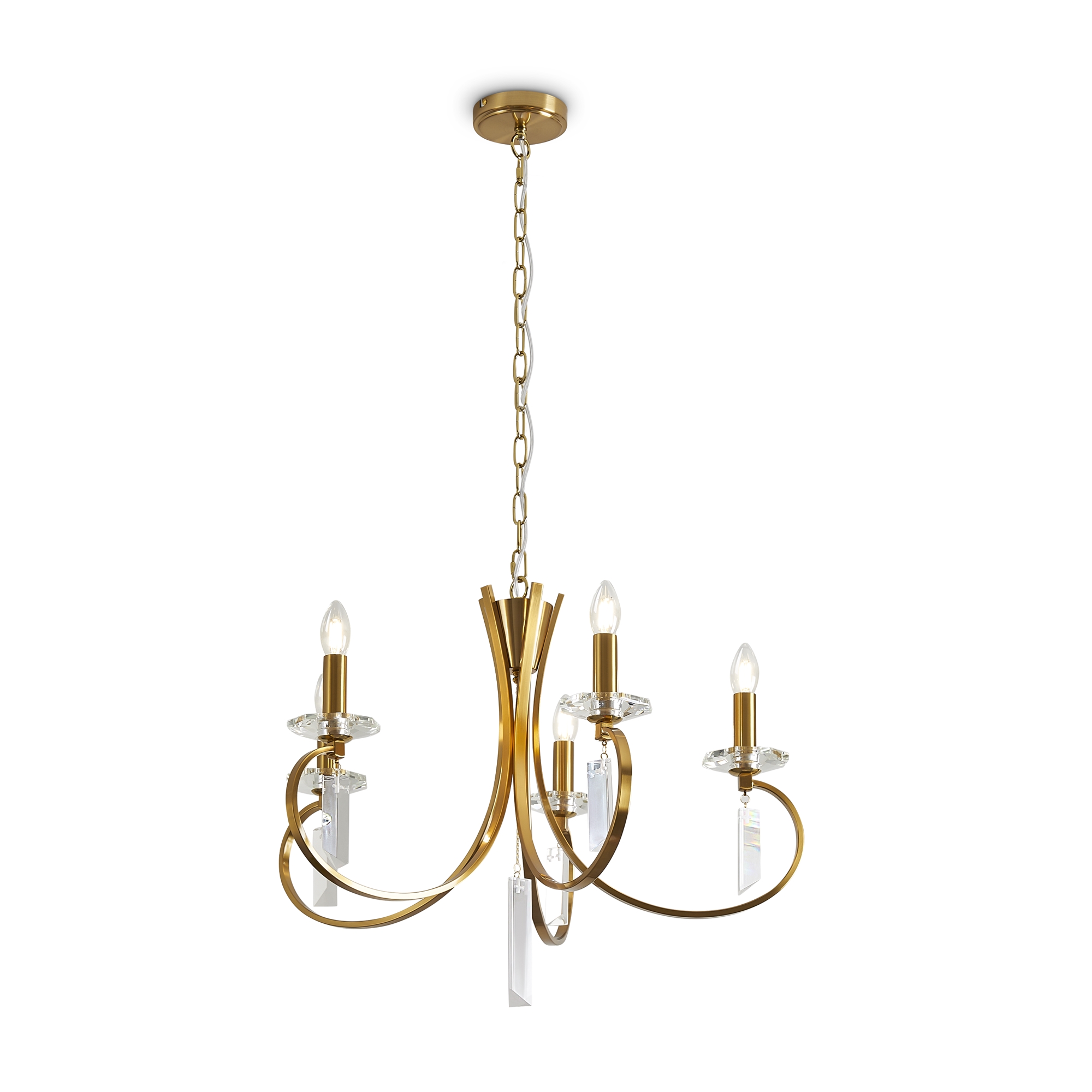 Материал арматуры — металл, цвет — никель или латунь. Подвесные светильники с цоколем E14. Доступны с пятью или шестью источниками света. Грани хрустальных подвесов создают эффект перелива радуги. Центральный декор из стеклянных трубок. Подходит для классических интерьеров.