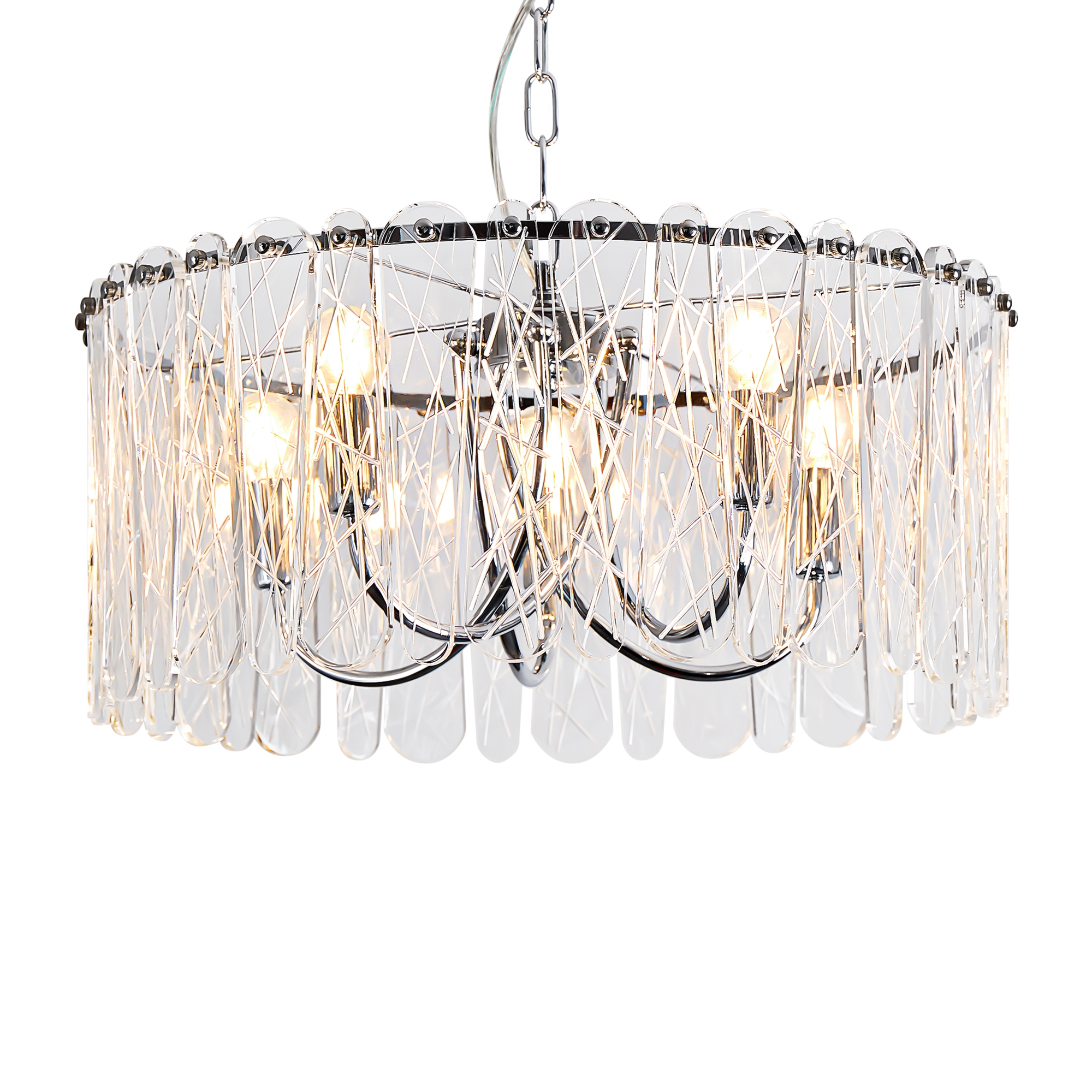 Материал арматуры — металл, цвет — хром. Светильники выполнены из хрусталя с рисунком «frozen». Подвесные светильники и бра с цоколем E14. Современный дизайн арматуры, дугообразные формы с хромированной отделкой подчеркивают декоративные хрустальные элементы. Подходит для современных интерьеров.