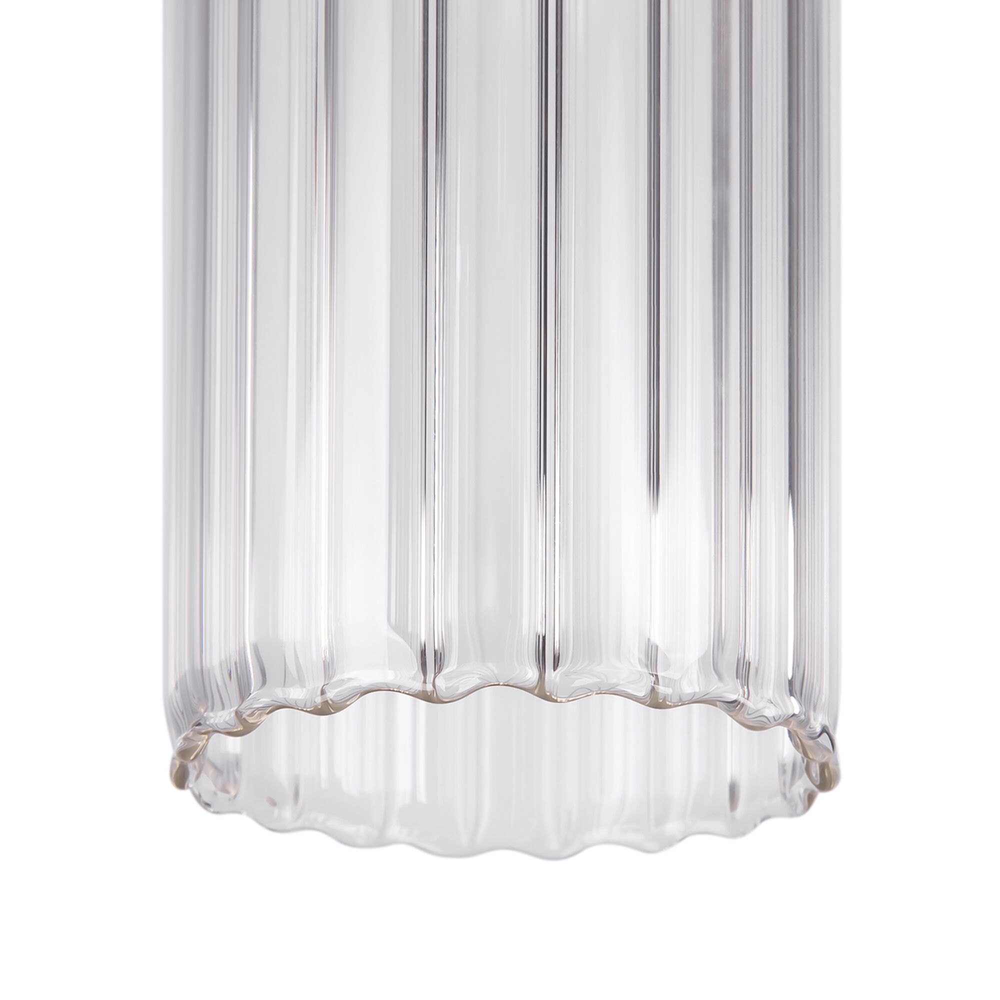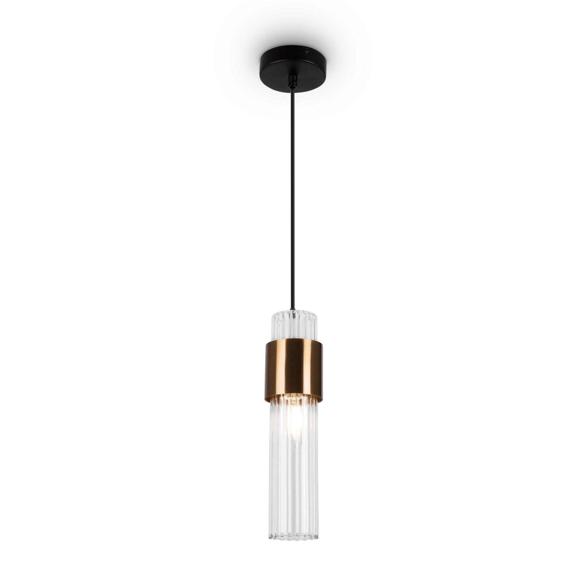 Арматура из металла черного цвета. Плафон – прозрачное ребристое стекло цилиндрической формы. Декоративная металлическая вставка золотого оттенка. Источник света – лампа с цоколем E14.