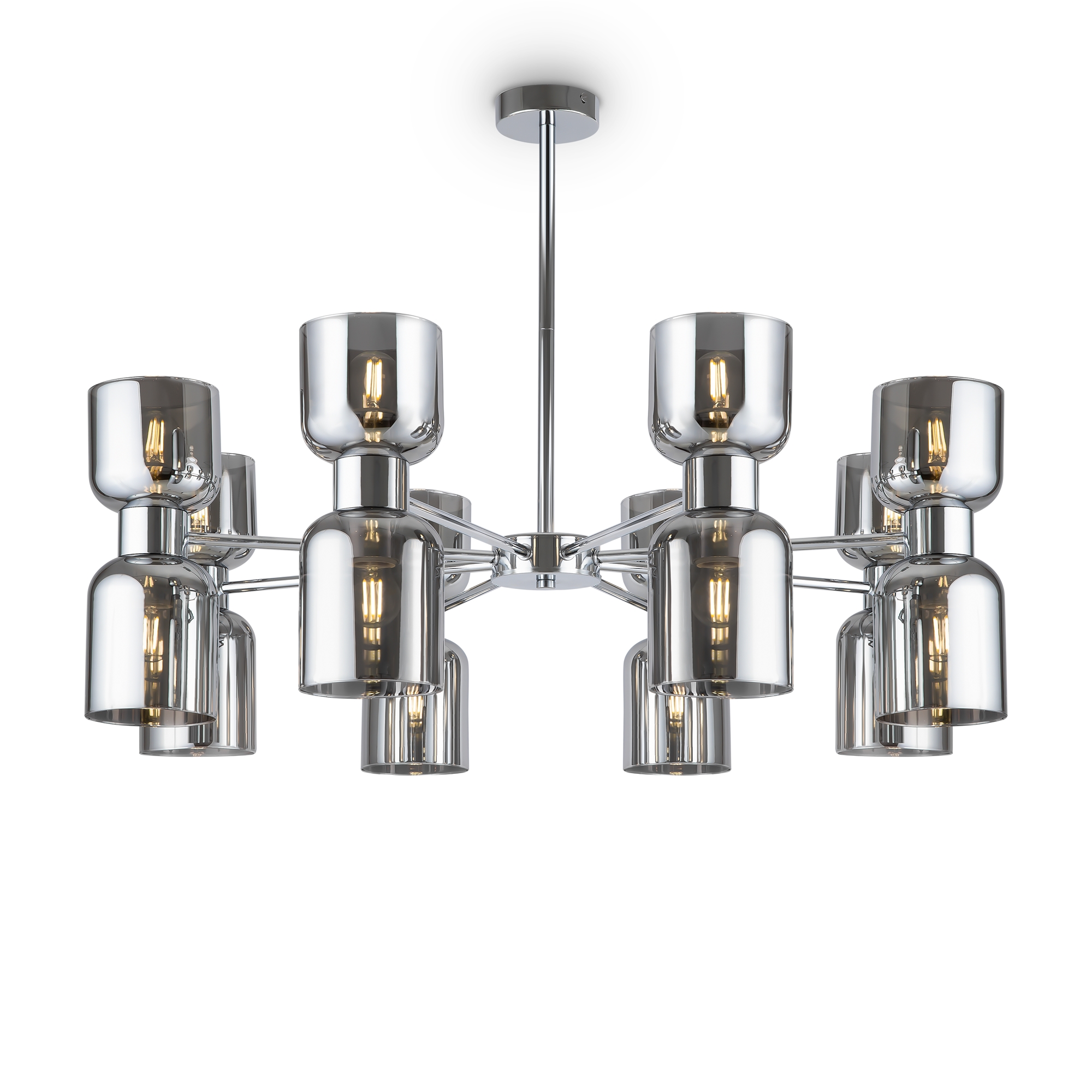 Арматура из металла. Оттенки – хром и латунь. Стеклянные плафоны в двух цветовых решениях: белый глянец и хром с зеркальным эффектом. Оригинальная форма плафонов «песочные часы», двунаправленный световой поток. Широкий ассортимент. Источник света – лампа с цоколем E27.