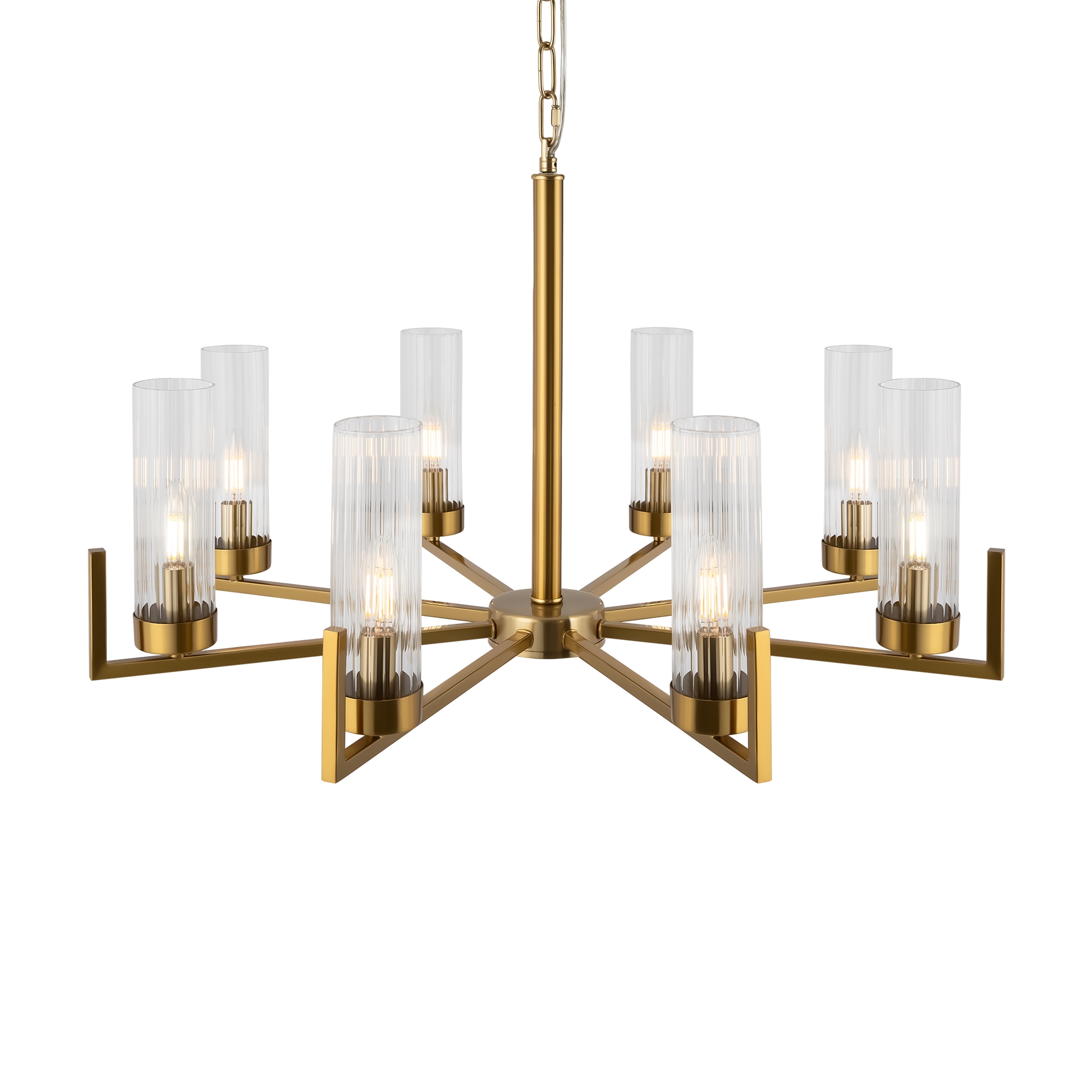 Дизайн на стыке классики и современности, выдержанная эстетика американского стиля в лаконичном исполнении. Adeline – выбор тех, кто ценит традиции. Арматура из металла представлена в оттенках хрома и латуни. Её строгий силуэт подчеркнут минималистичными плафонами-цилиндрами. Граненое стекло с ребристым рисунком – актуальный тренд, создающий модный контраст фактур. Направленные вверх источники света равномерно распределяют световой поток по комнате и визуально приподнимают потолки. В серию входят люстры на 5, 8 ламп и бра – вы можете сформировать комплексный световой сценарий с общим и зональным освещением. Элегантный дизайн актуален для интерьеров в стиле неоклассика, ар-деко, модерн.