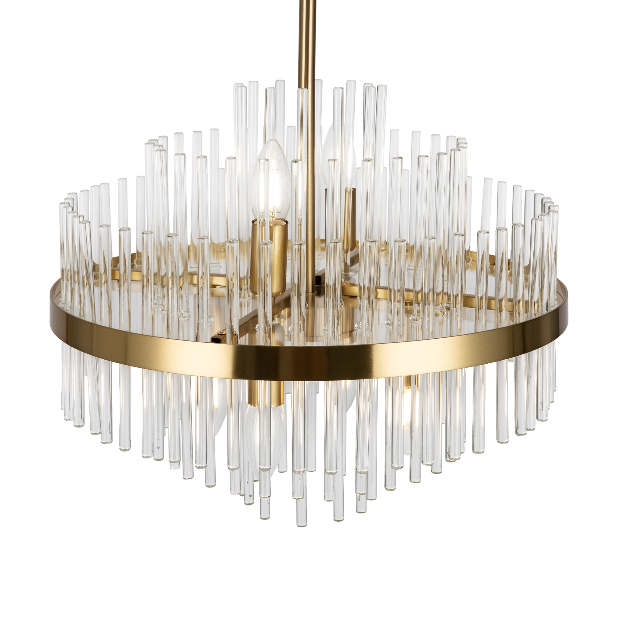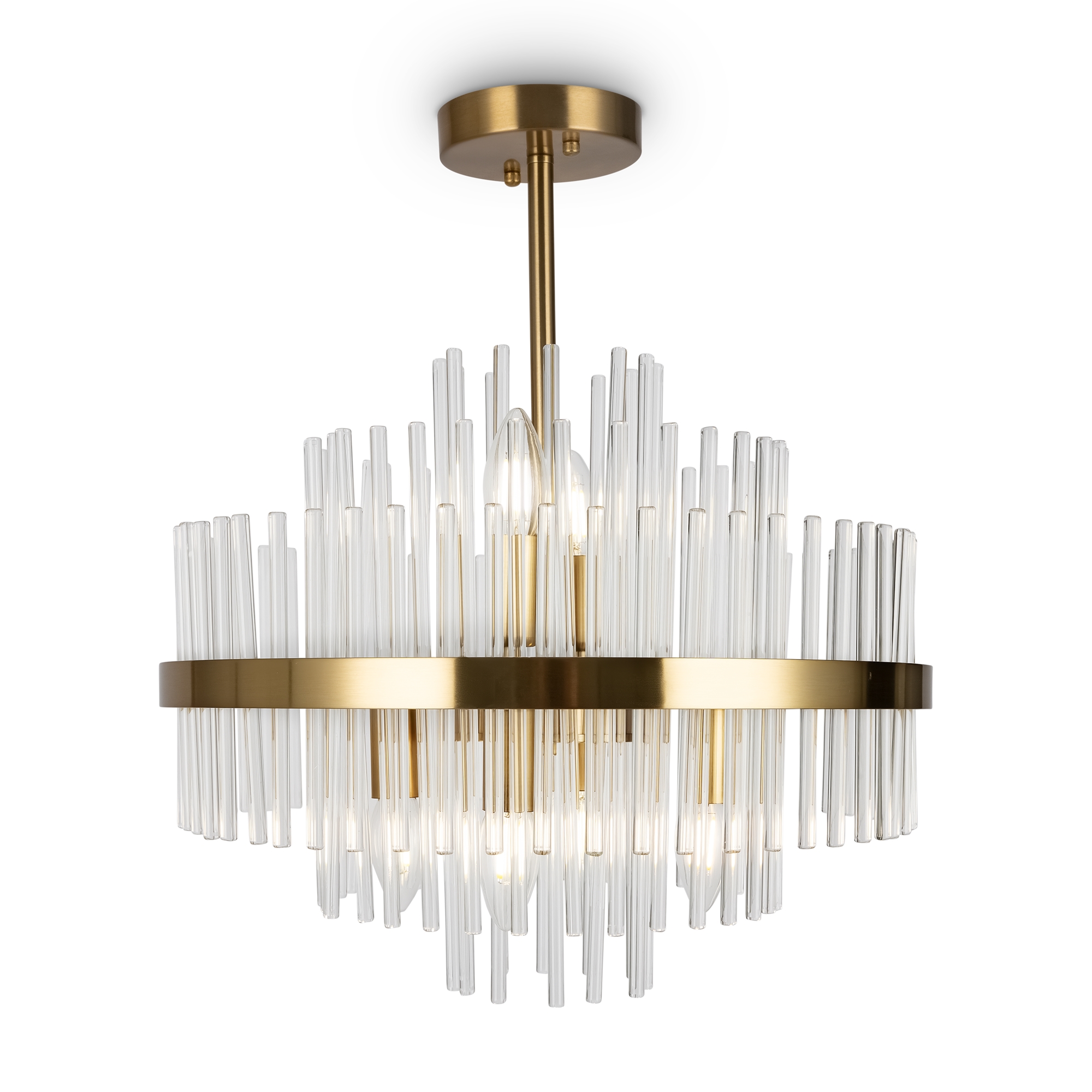 Металлическая арматура, цвет — латунь. Декоративные элементы — прозрачные стеклянные трубки, обрамленные в металлической кольцо в тон арматуре. Источник света — лампа с цоколем Е14.
