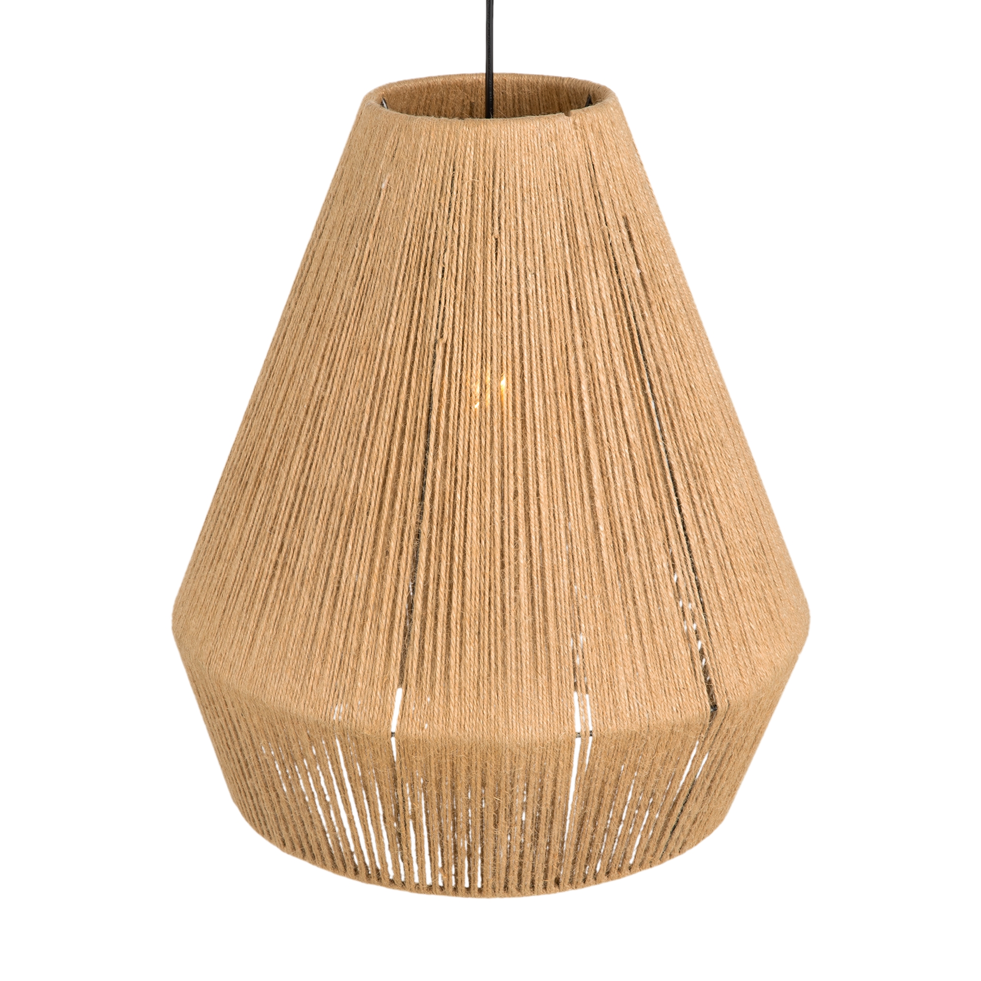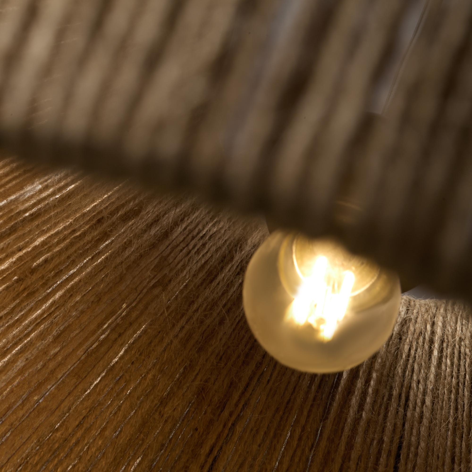 Материал основани чаши — металл, цвет — черный. Абажур из натурального джута — вдохновлен природным шиком плетеной мебели для загородных пространств. Заменяемый источник света — лампы с цоколем Е27. Регулируемый провод.